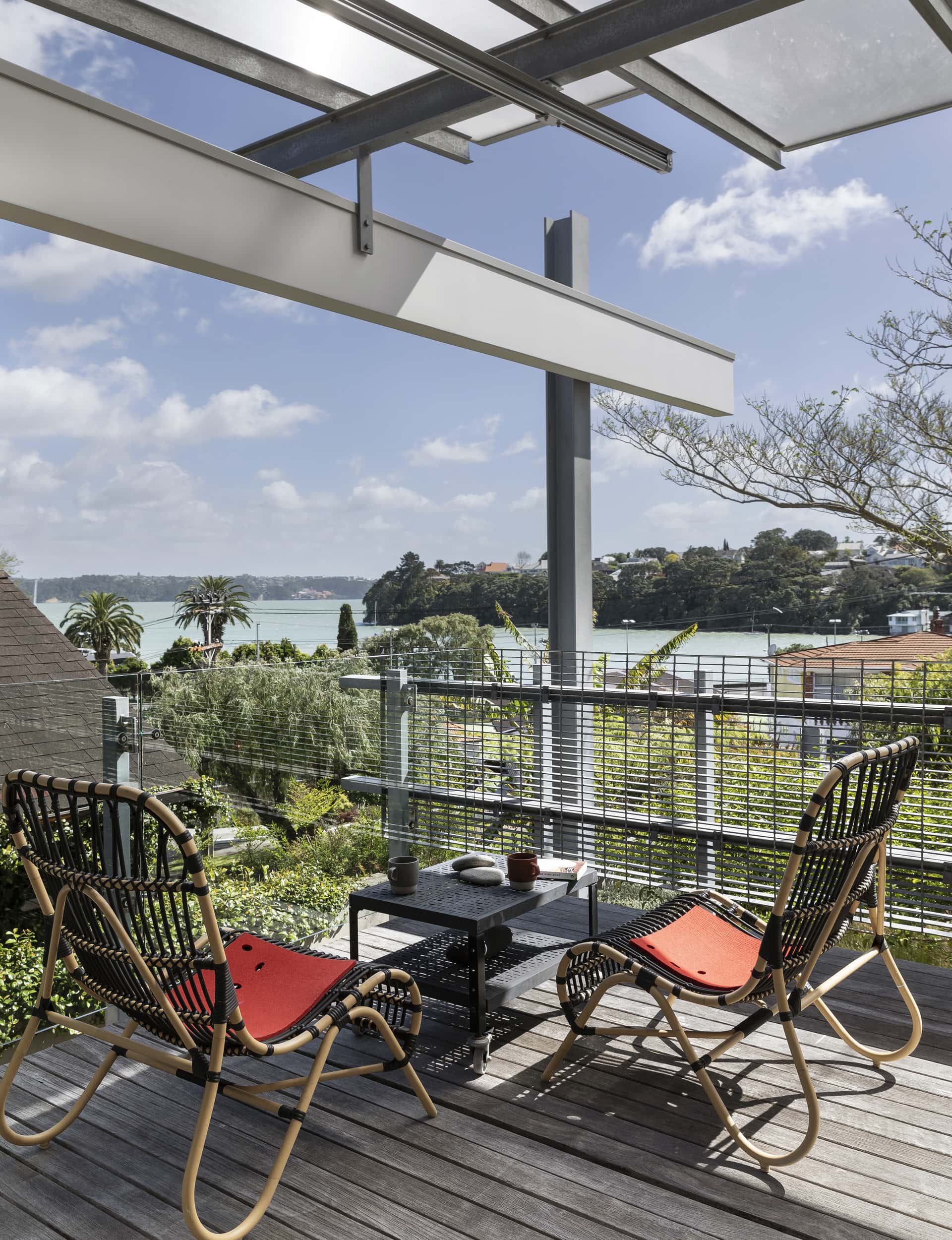 The house is oriented really well for the views and sun. There’s an outdoor area to the north-east and north-west orientations, so we get all day sun with areas to be outside. The north-east deck faces lovely views over the West End Tennis Club toward Cox’s Bay, with one of my favourite collections of buildings – the Chelsea Sugar Works – visible in pink across the Waitematā on the North Shore.