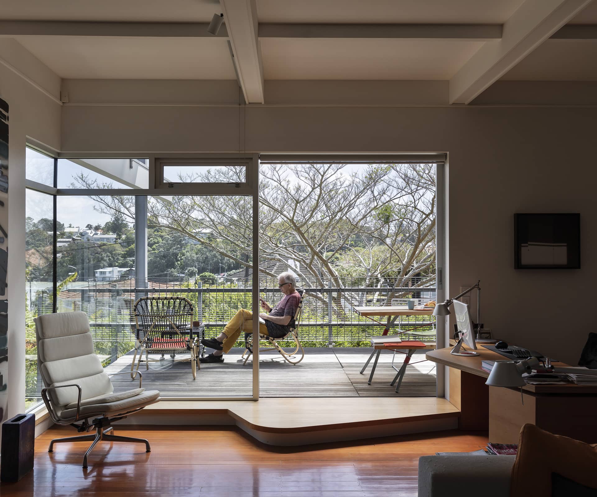 The north-east deck is one floor above ground level. It extends the main living area towards Cox’s Bay and the harbour, and provides an additional outdoor space. It opens off a space which was an office and is now used for reading and yoga.