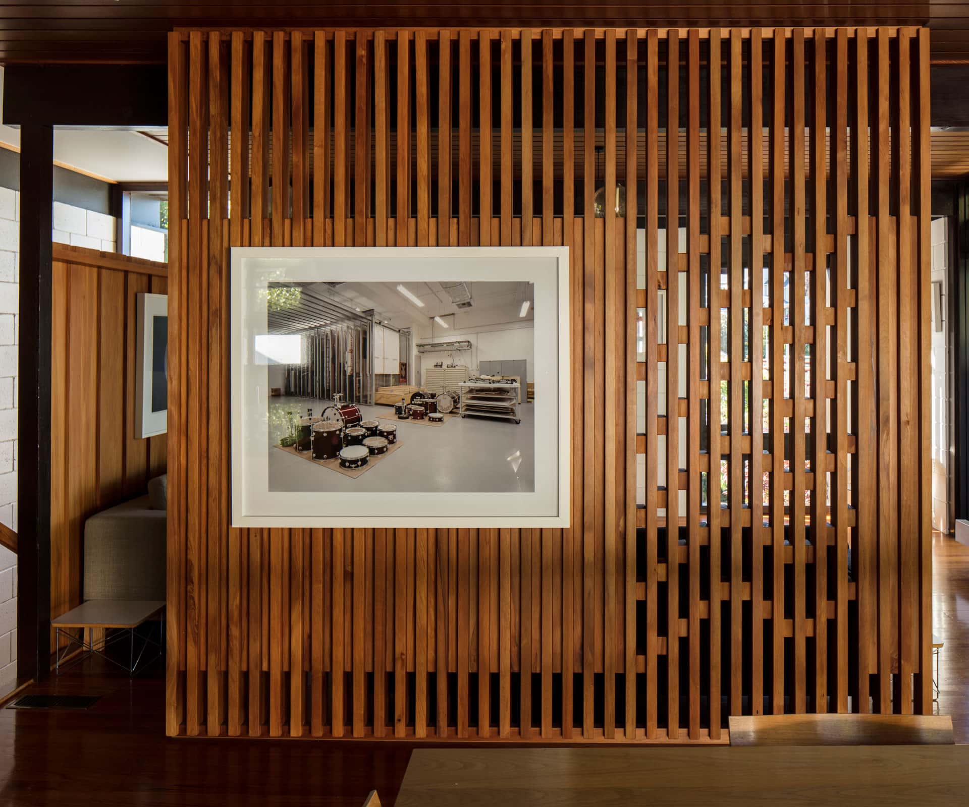 She designed a line of timber batons that define a smaller living area – and provide much-needed hanging space for the couple’s art collection – while allowing better access to the new deck and a flat lawn, terraced with concrete retaining walls. In the new kitchen – open to the whole space – she reinterpreted the original cabinetry with sustainably harvested rimu.