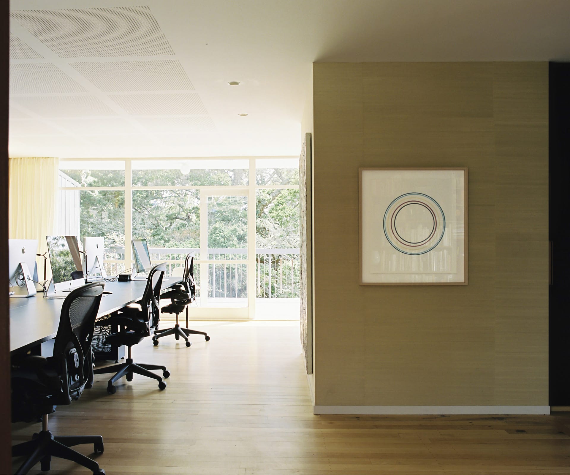 AM— The new studio is essentially a treehouse; the extensive glazed wall and deck situates the workspace high in the canopy of established native bush and regularly attracts curious feathered onlookers. The nature of our work is deadline-driven – things can get quite manic and stressful, so having a tranquil environment is a really nice temper to that.