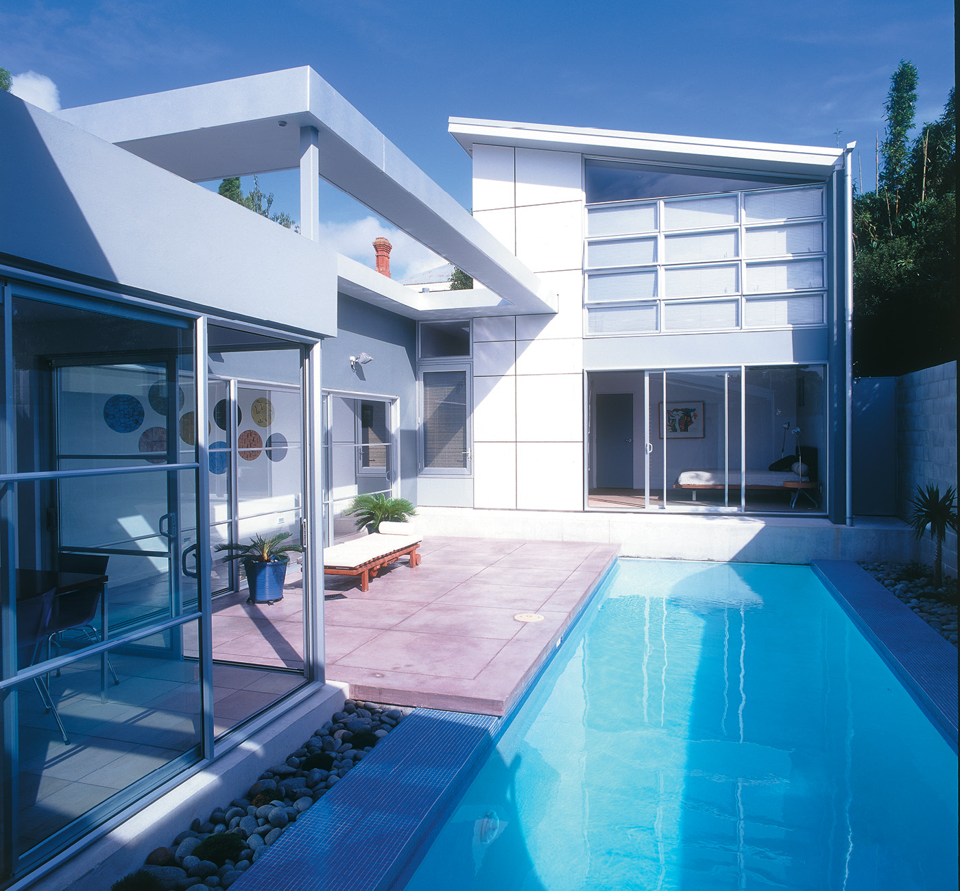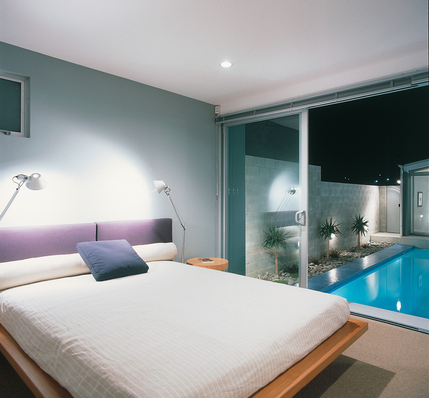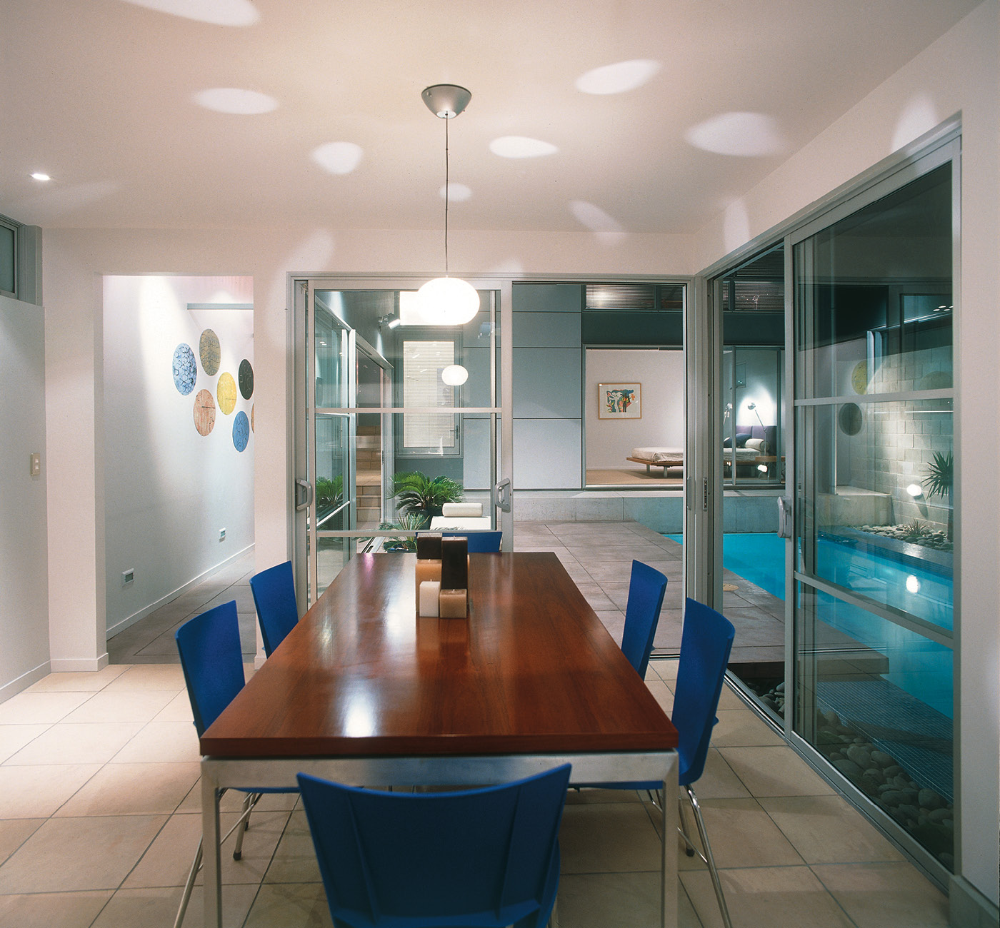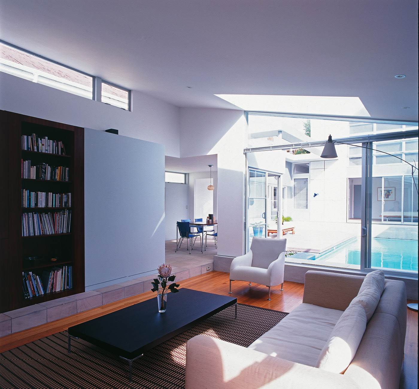 Two identical pavilions at either end of a courtyard are linked by a glazed ‘gallery’ that feels only slightly more substantial than a covered walkway. Building to within a metre of the boundary on three sides, Hall has made economical use of the 316 square-metre site. And by turning the house’s focus inwards onto a private courtyard, his design cleverly overcomes the urban obstacles of lack of privacy and views. Taking the place of a distant vista is the glistening swimming pool.