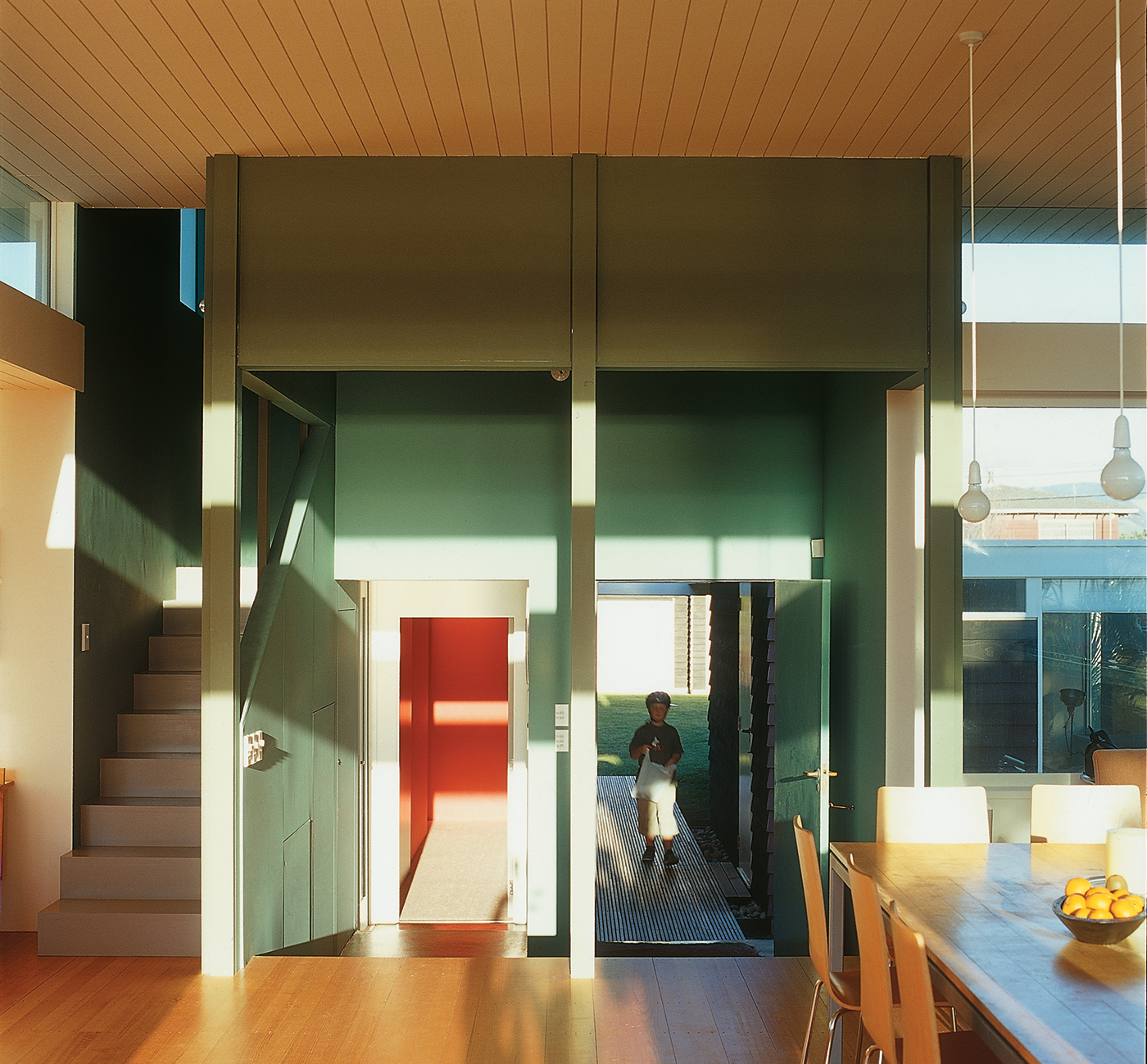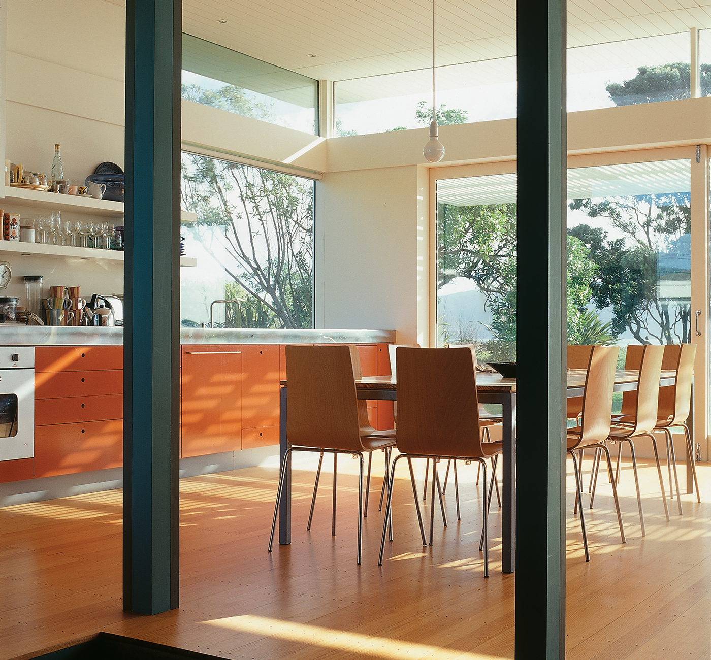 Behind the tower, a passageway is painted in watermelon red and lined with windows of orange hand-blown glass. The result is an unexpected and somewhat outrageous play of colour. “I was looking forward to experimenting here because I haven’t used much colour before and it’s something you can play around with in your own home.” Parsonson adopted advice he’d been given by fellow Wellington architect John Mills: “If you’re feeling worried about colour, make it stronger”.