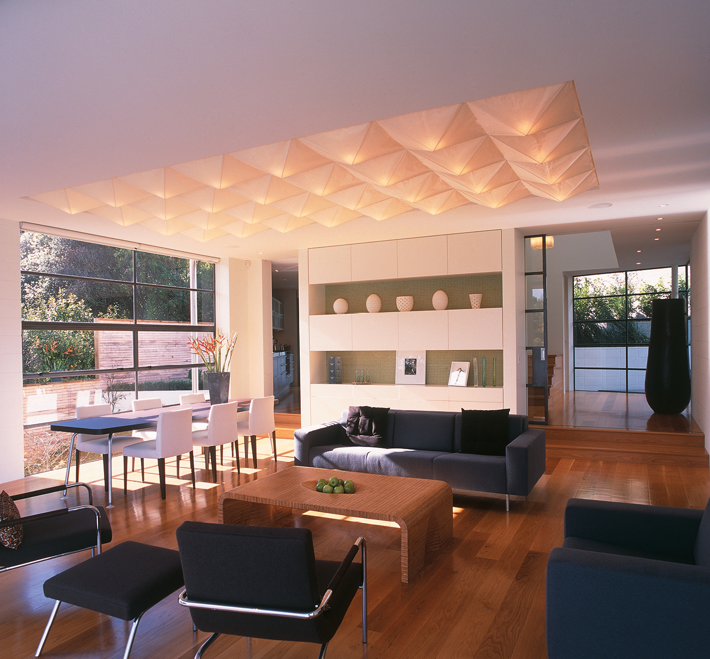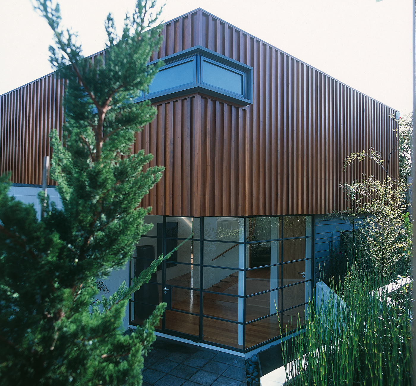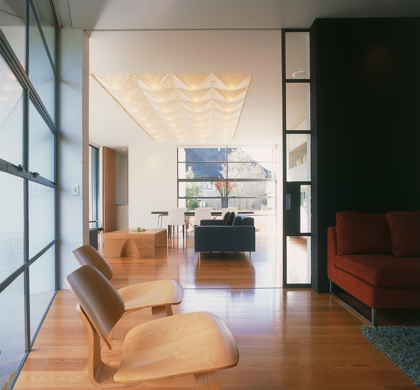 The double-height entry hall is reached through a steel and glass door and the windows are reminiscent of a Shoji screen. Oak flooring gives this space the feel of an art gallery.