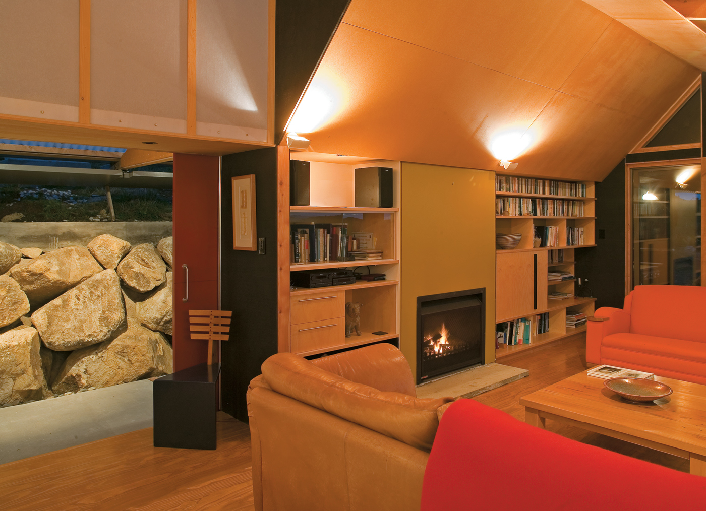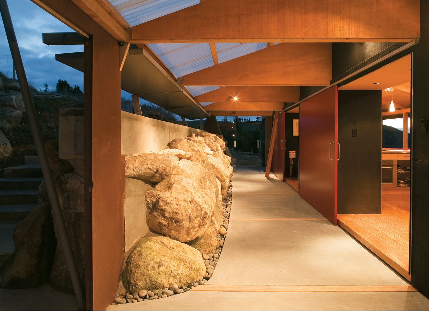 A nearby farmer was surprised and not a little bemused at the architects’ request to deliver truckloads of Rhyolite boulders, prevalent in the King Country, to the building site. Artfully arranged in textural walls, they add an original and localised element to this indoor/outdoor ‘room’.