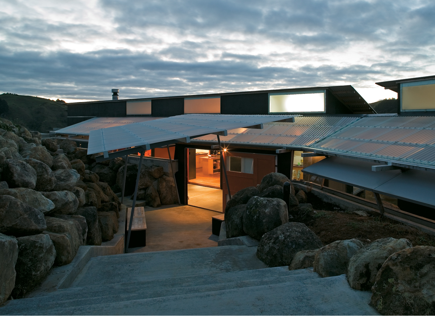 Mindful of creating an open structure to capture the north-west panorama, Mitchell Stout wanted to provide some contrasting solidity on the south face of the home. They settled on a covered corridor, dug into the hillside, which anchors the house and forms its spine.