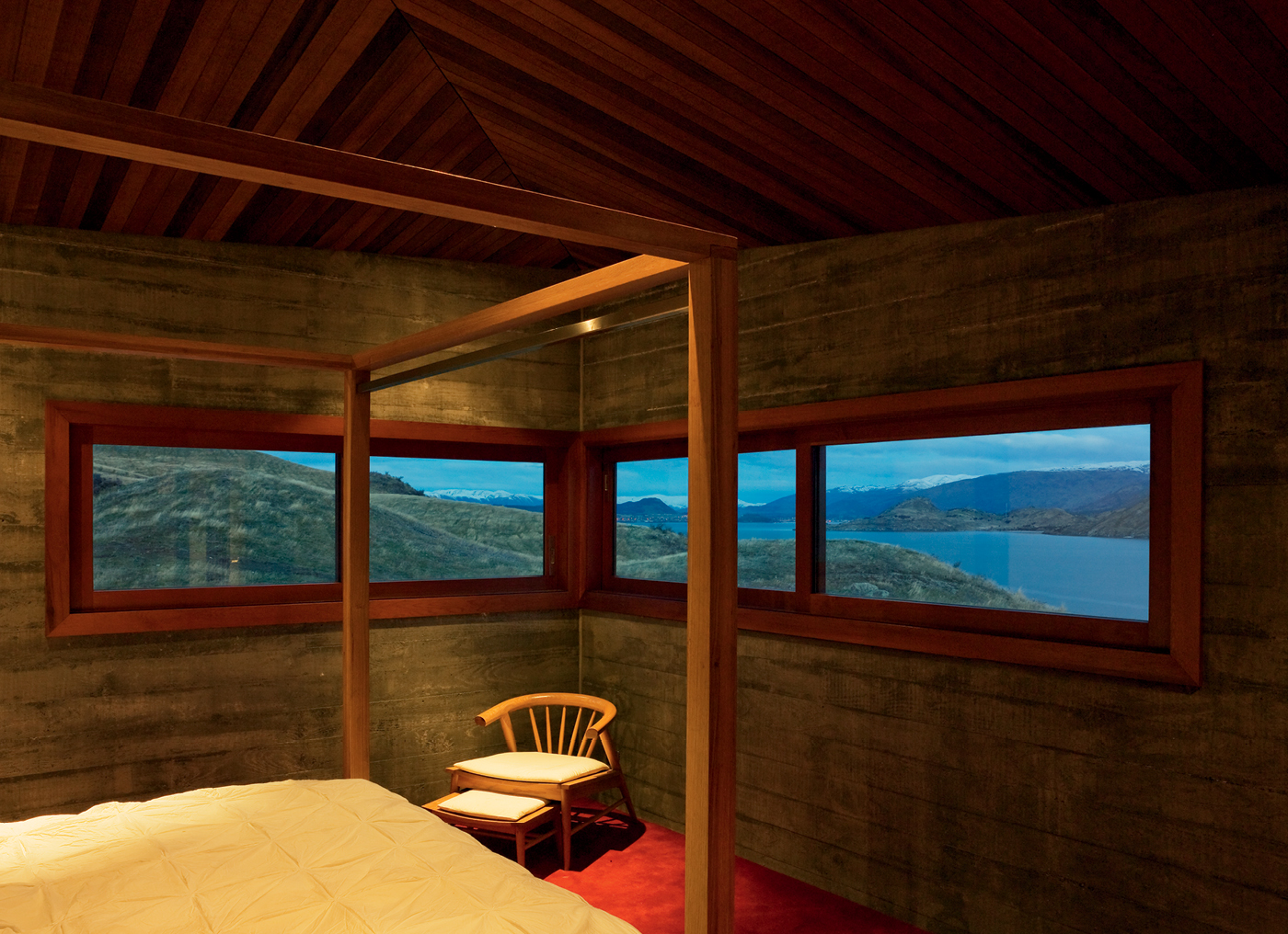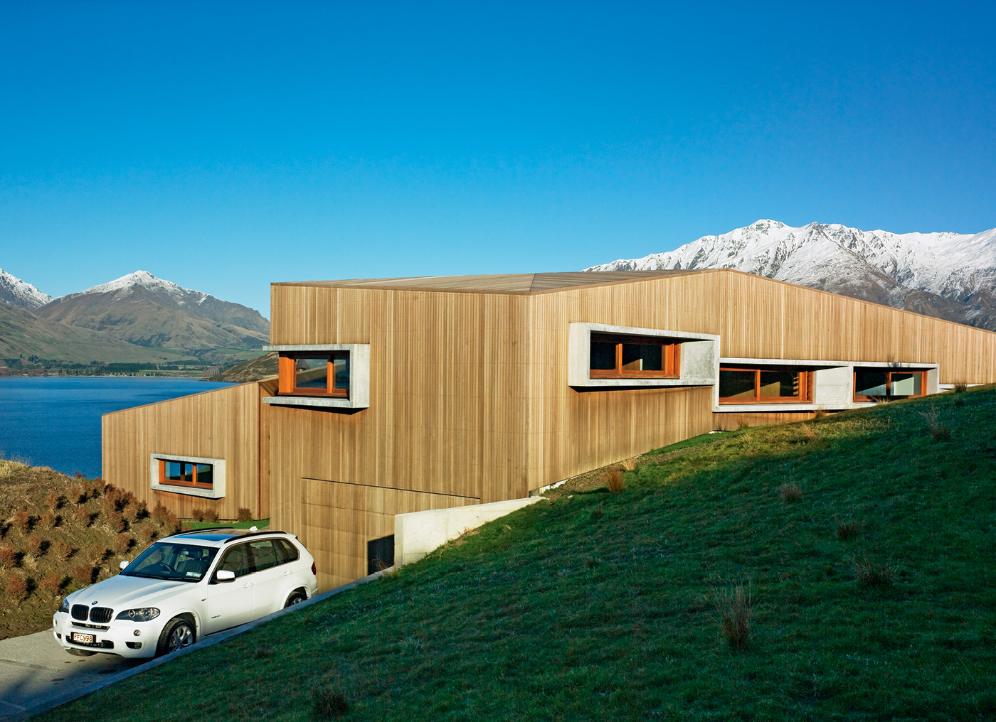 Thus the house appears to hug the terrain as it slopes towards the lake, mirroring the angle of the distant mountain ranges at the lake’s western arm as it does so. (Concealed amongst all this are eco-friendly features such as on-site sewage treatment, a bio-diesel generator as a backup to the mains supply, rainwater collection, double-glazing, above-code insulation and solar-enabled water and power systems.)