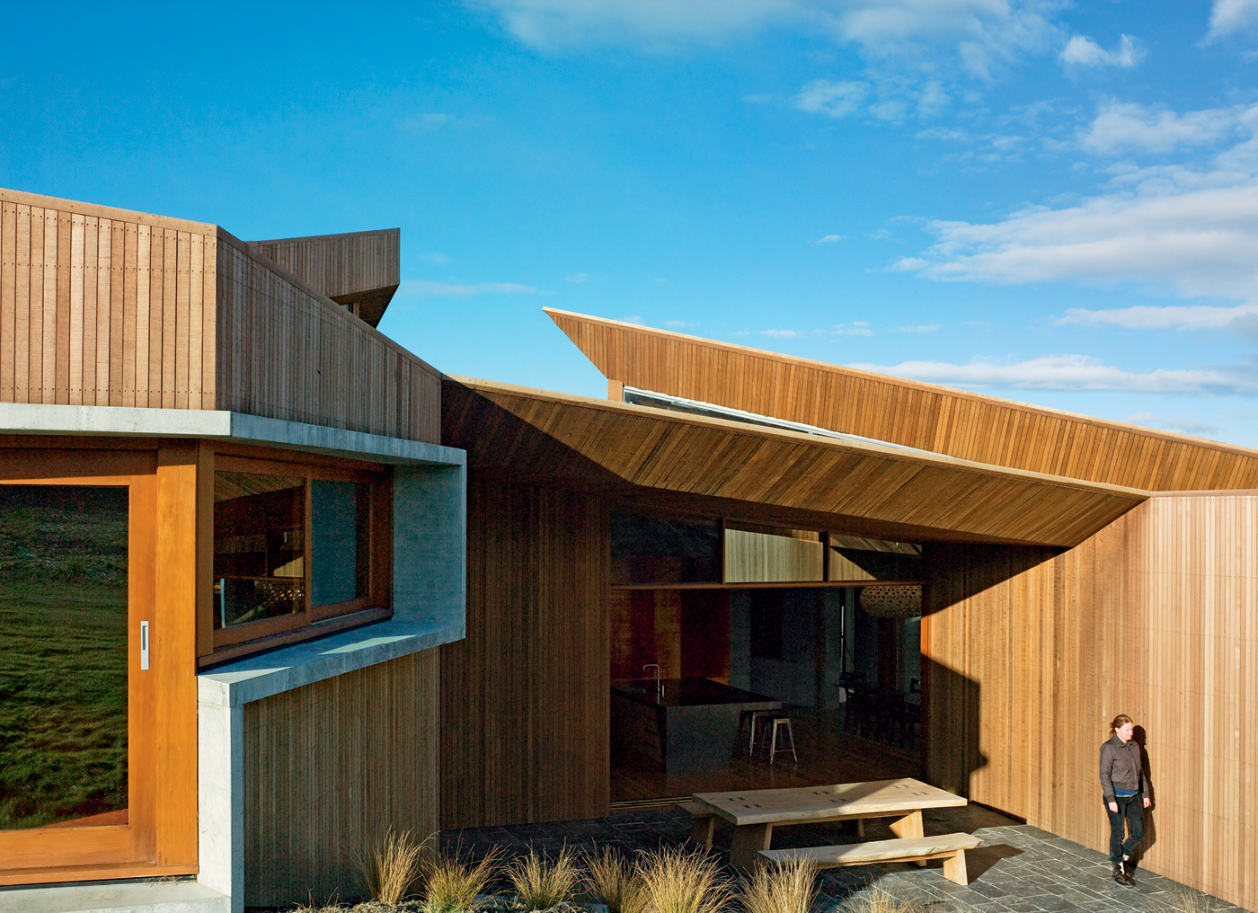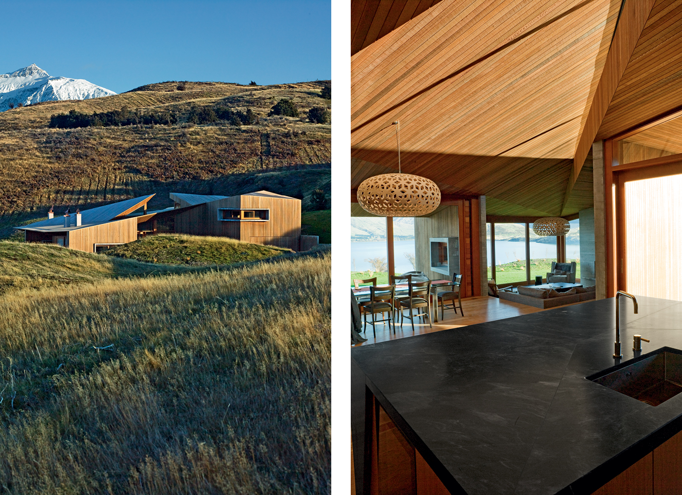 There are cast concrete walls, schist floors, and a folded timber ceiling hovering overhead, as if a cedar skin has been stretched over a concrete skeleton. This approach, Nicholas says, was engendered by “the way the tussock is laid over the rocks like a blanket or cloak”, or as Gary puts it, the appeal of “something delicate laid over something incredibly strong and robust”.