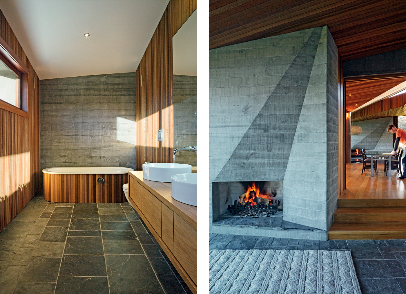Appropriately, the circulation patterns inside the house are organised along diagonal lines rather than right-angled regularity. The entrance, with its large doorway and handsome staircase, invites visitors in with a view across the dining area to the sunken living space, a diagonal procession culminating in the dramatically faceted concrete fireplace and the view, previously withheld, of the lake and the mountains to the south.