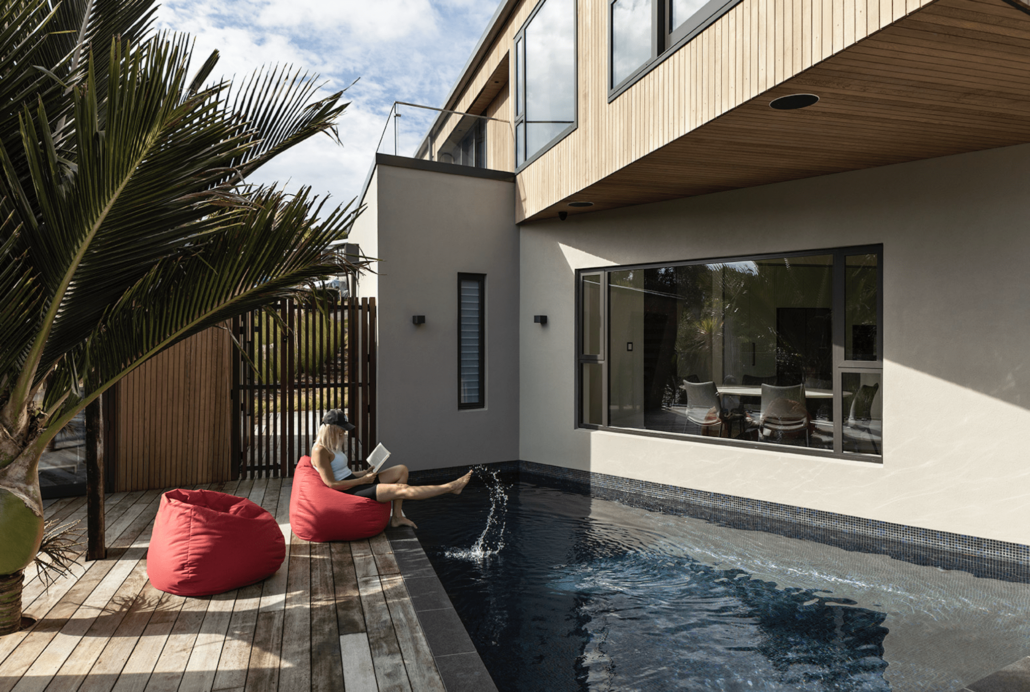 This two-storey Beach Haven home of sharp geometries is designed around a trapezoidal plunge pool, over which the upper level is cantilevered.