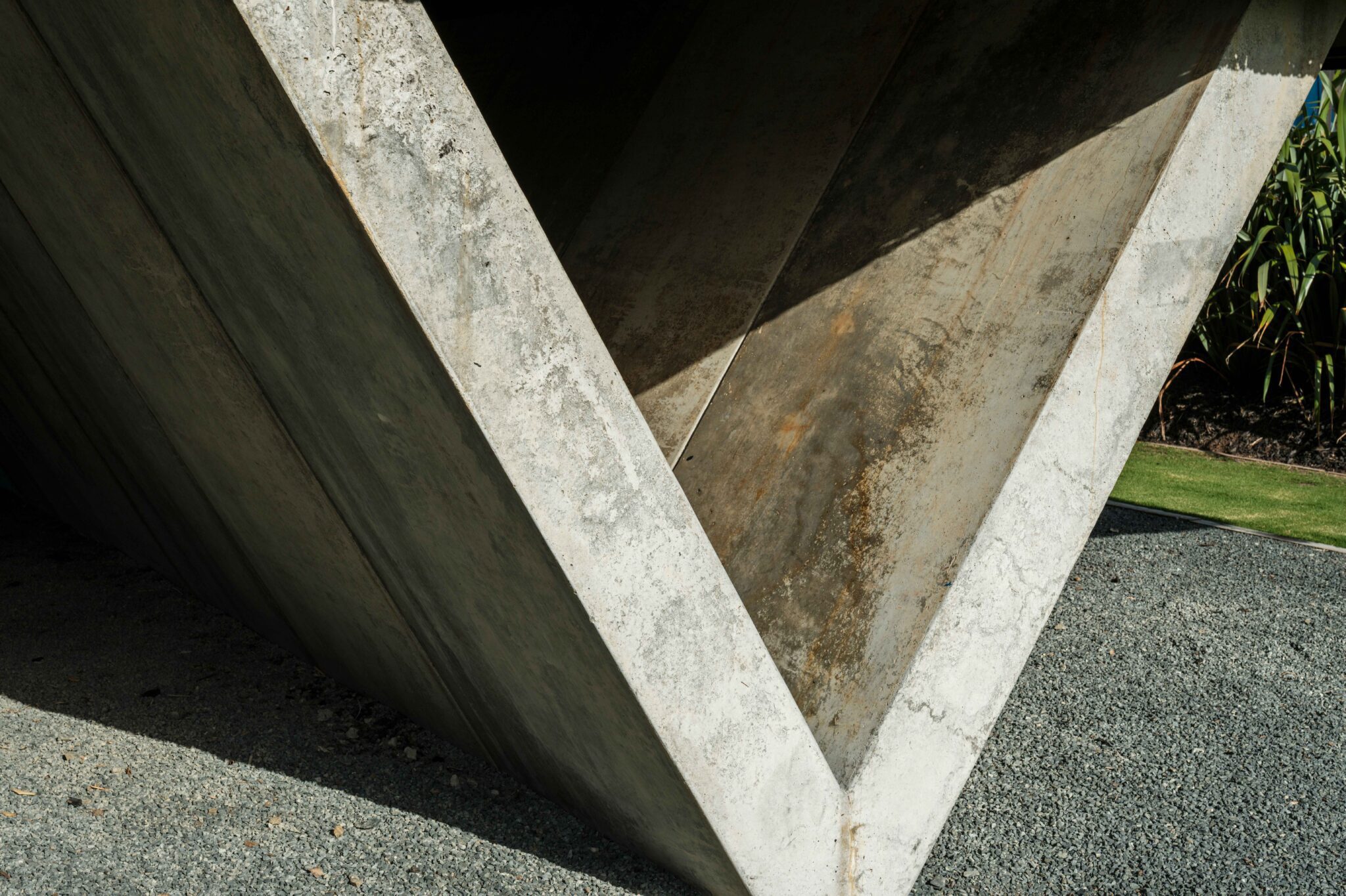 It is composed of a minimal, brutalist pavilion balanced on sharp, concrete V stilts. “They are actually an X,” explains the designer; the lower, inverted V has been dug deep into the sandy land to ensure stability. Tate recalls the many difficulties presented by its design: “I was limited to how big I could make those Xs because they are precast and there was a limit as to how much size and weight could be transported to site,” he says. “They had to be designed to the limit of cartage.” This meant he had to splay out the bottom half to make them fit. “We had to dig the whole site out because it was sand, and temporarily retain the whole thing. There’s 500 by 600 railway lines running through the site, and we’ve got piles down to 18 metres,” he continues.