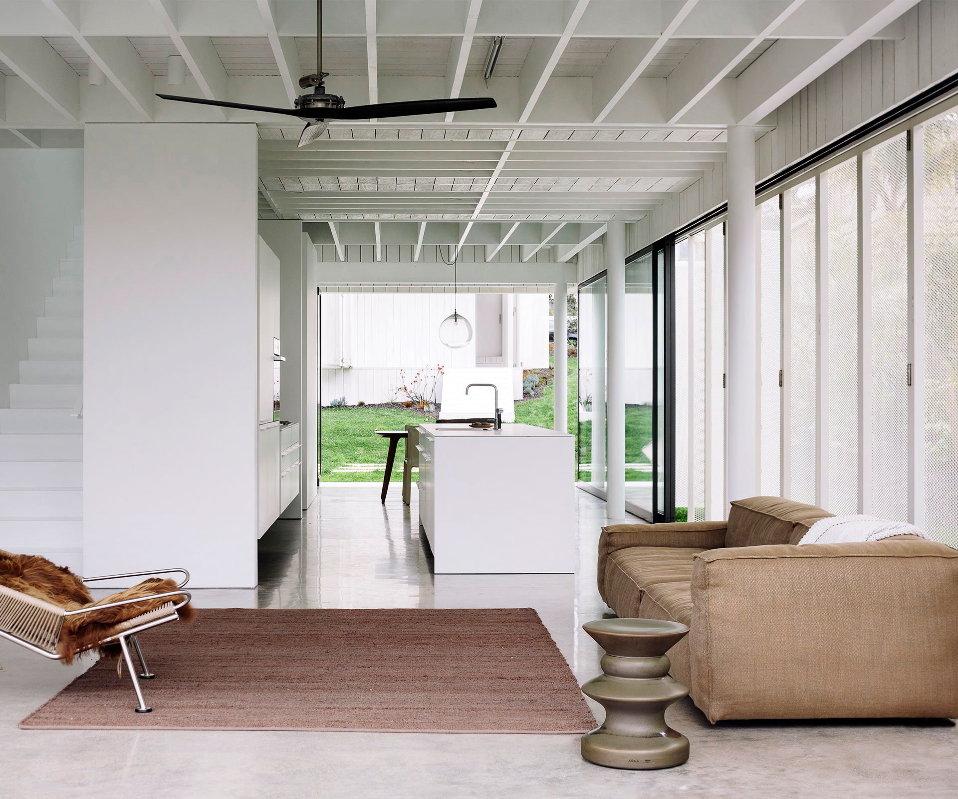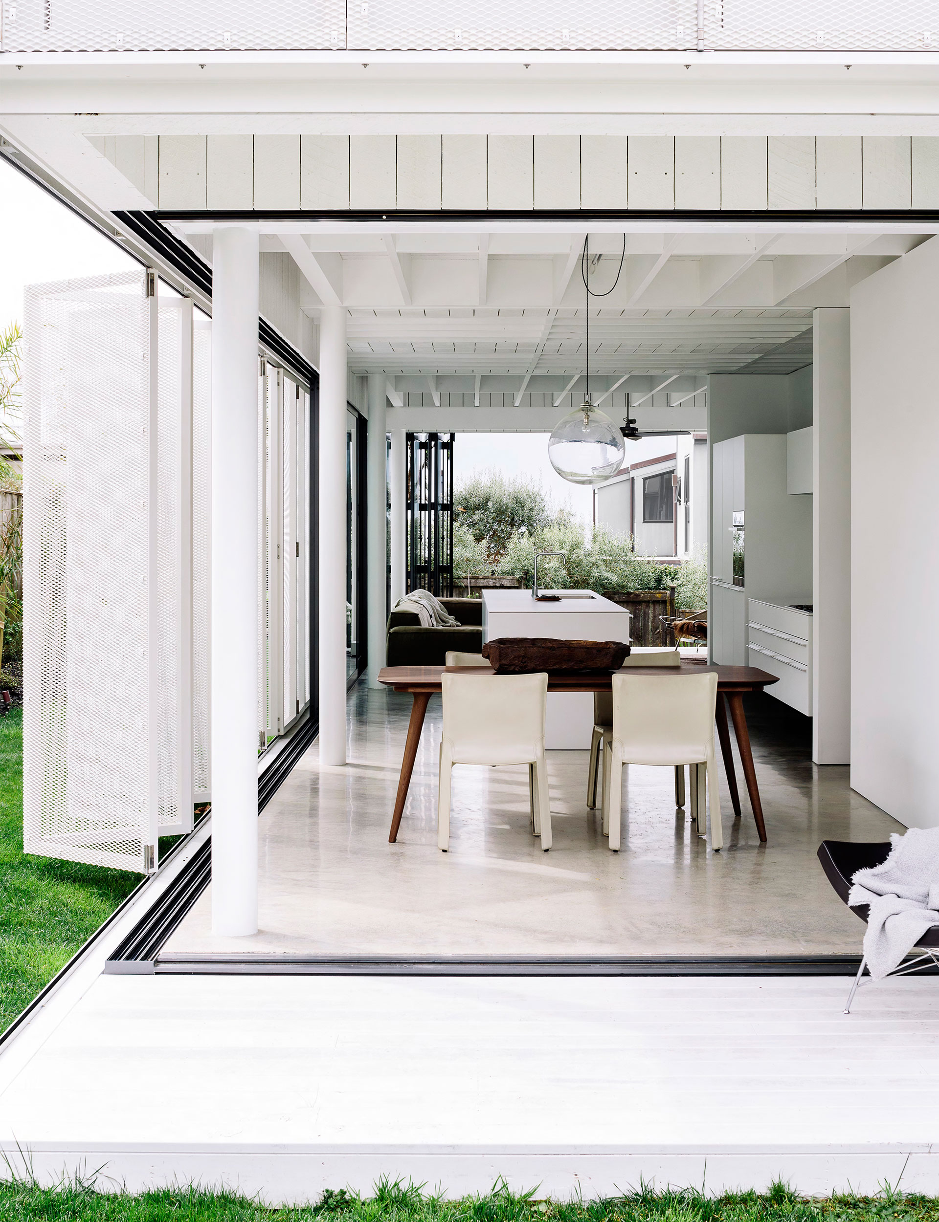 Instead of covering the structure up with expensive materials, they left the four steel portal frames exposed and painted them a crisp white. The same shade of white was applied to the exposed timber rafters that have been designed to change direction in a beautifully thoughtful way above the kitchen, defining the zone and casting pretty shadows. The floors are polished concrete, and the joinery is black aluminium.