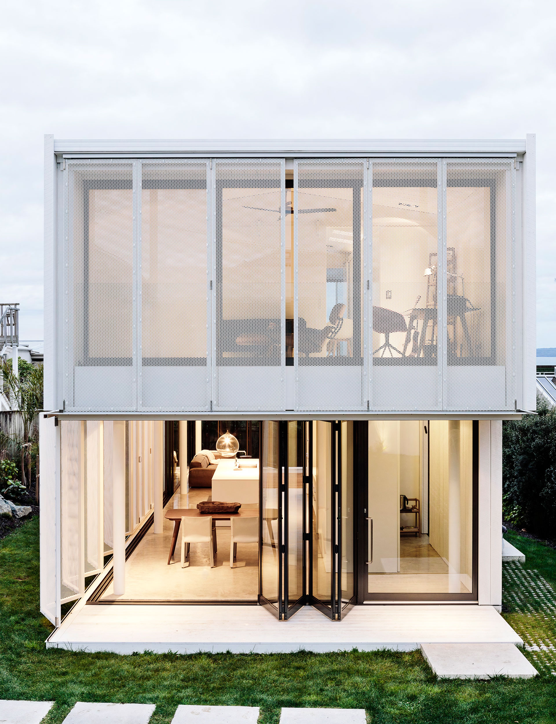 The closeness of those neighbours also drove the architects to install perforated metal screens around the entire structure: they can be opened up completely or shut down for privacy. When this happens at night, the whole thing glows like a lantern.