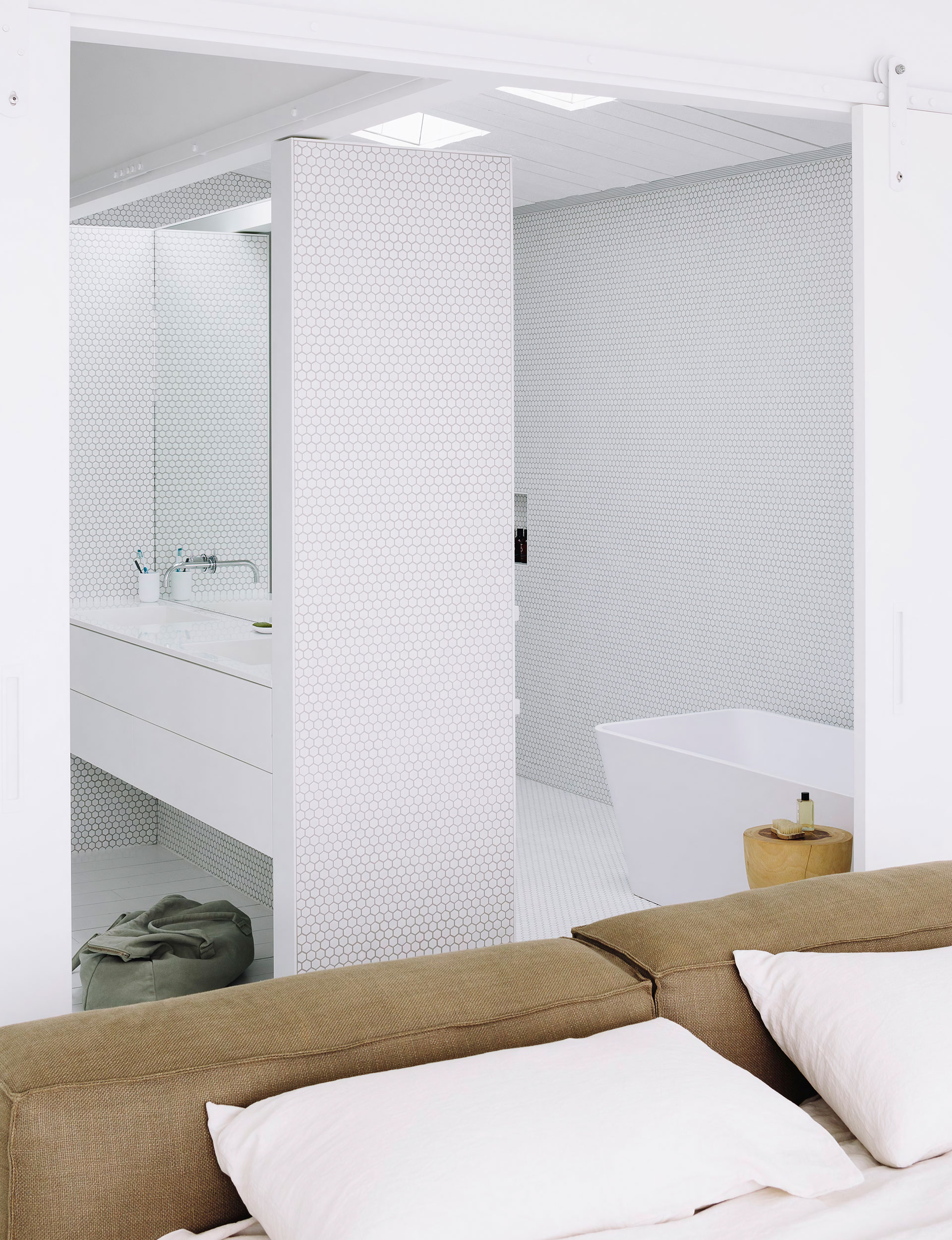 Upstairs, it’s delightfully simple: an airy bedroom with a view of the ocean, a study and bathroom in between. The rooms are modestly sized; walkways are economical without feeling mean and yet there is a slipperiness to the plan – the macrocarpa ceiling extends over the tops of the walls, making it feel like one continuous space, while large white MDF doors on chunky white metal rails slide back and avoid occupying too much space.