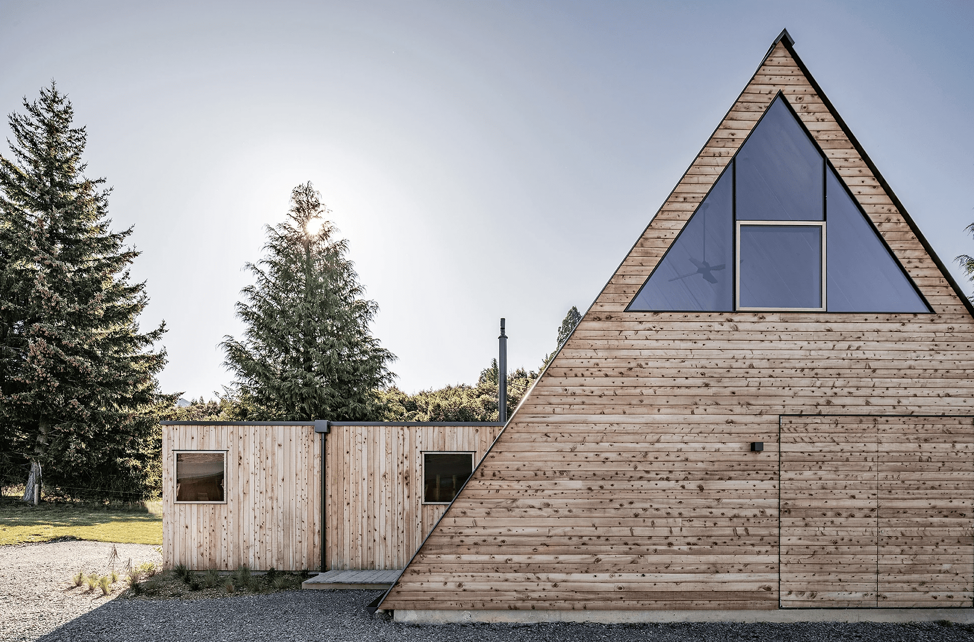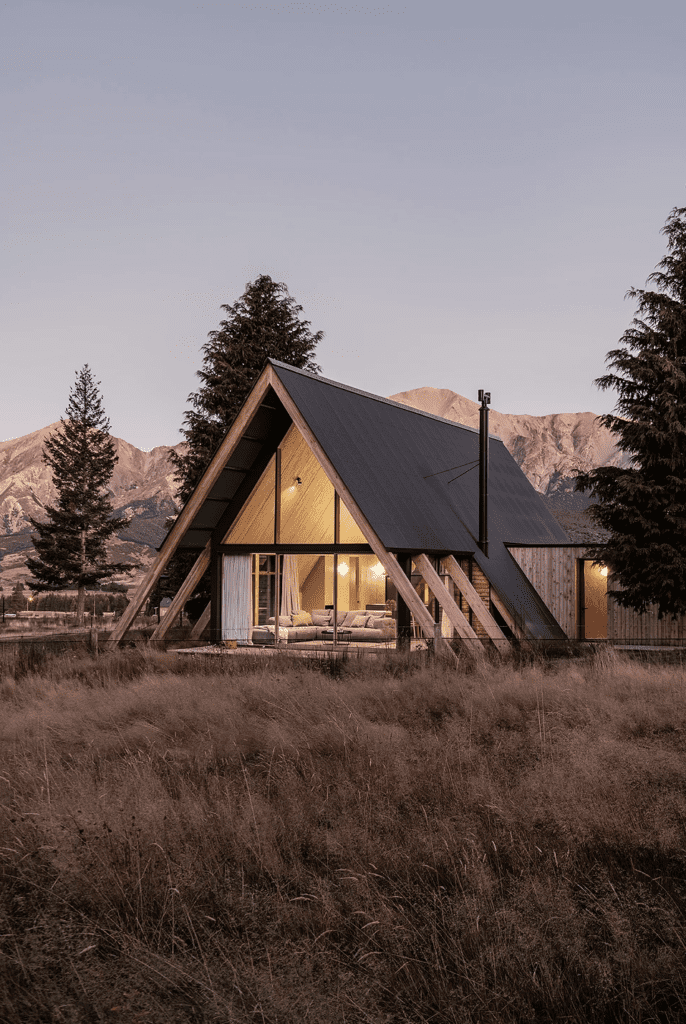 Envisioned as a base camp for outdoor activities in the vast expanse of Canterbury’s high country, this compact abode is cut from the cloth of the traditional A-frame, and woven with a decidedly modern spin of colour and texture that echoes the alpine environment.