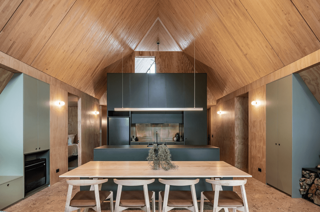“It was a journey to draw those colours from the environment. The hero is the dark, bold green of the kitchen cabinetry, which we took from the classic high-alpine native bush, where you get the really dark tones of mountain beeches and their black trunks and dark leaves. The mossy green reflects the lichens of the region, and the burnt ochre tone we took from the colours of the tussocks in summer as they dry out.”
