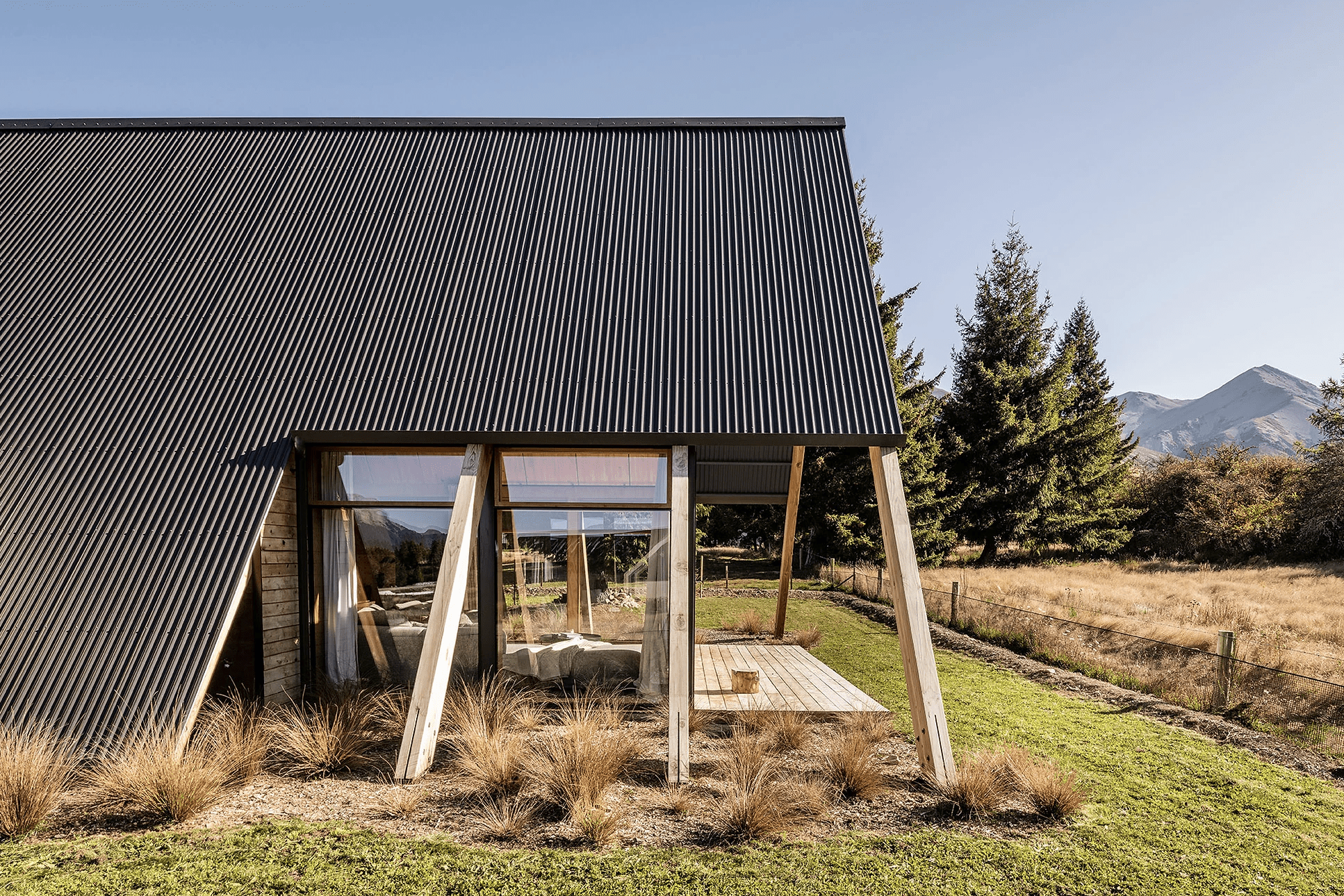 Lodged between two mature trees — its apex marking a middle ground — this cabin is neither obtrusive nor dwarfed; it stands proud, with its face to the sun and the Craigieburn Range and its back to the peaks of Porters Pass.