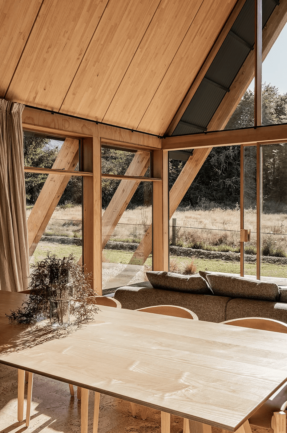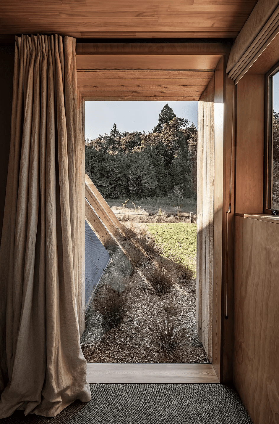There’s an inherent honesty to this building in its partly exposed structure. “We didn’t want to cover up those structural elements; rather, we wanted to celebrate them,” Ben says. The beams are buttress-like, demarcating the built form from the gently encroaching tussocks and grasses.