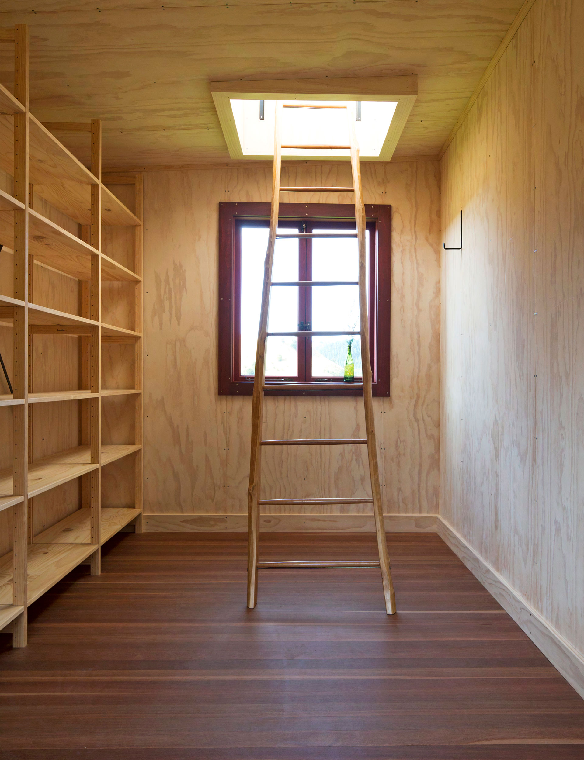 With a compact footprint and classical double-storey form, the Longbush house is the perfect dwelling for a couple. A low mono-pitch roof tilts to the north and sheltering eaves protect the house from the harsh extremes of the weather. The interior has the fine-grained quality of a handmade piece of furniture. It is warmly inhabited, well-stocked with books (many written by Jeremy and Anne) and plenty of comfortable places to sit and read them. Jeremy describes it simply as “one room on two levels connected by a void”.