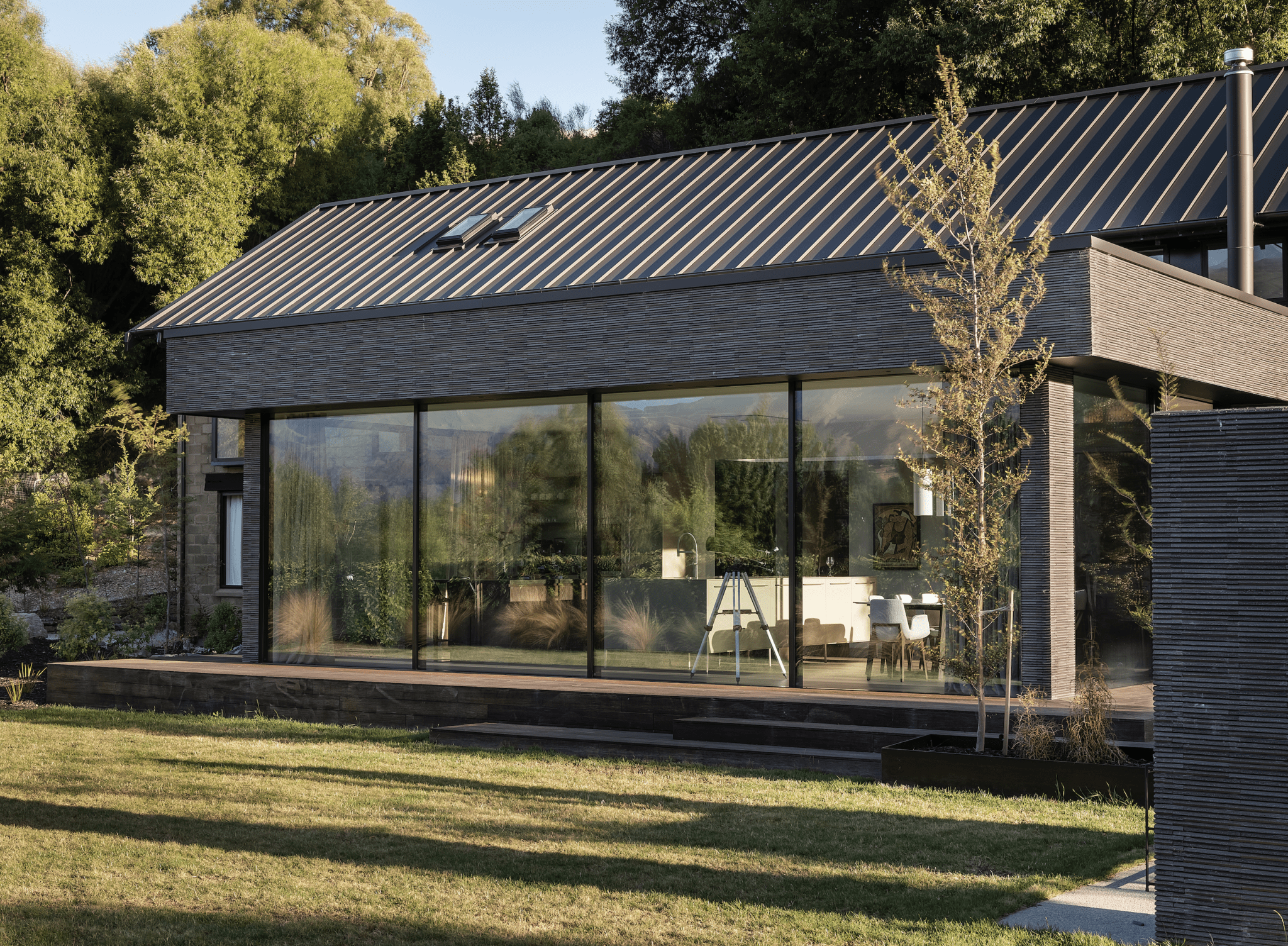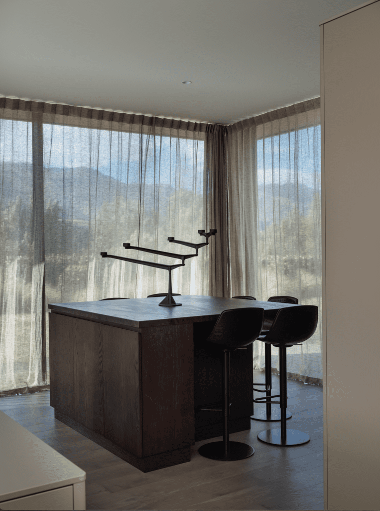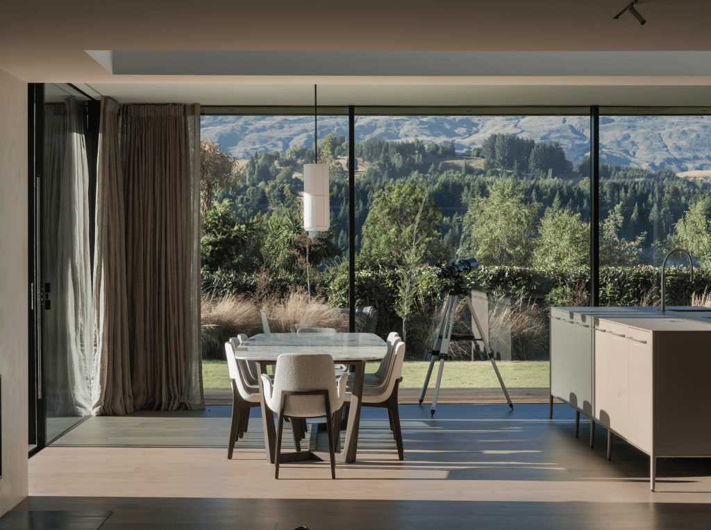 “Maximising the views was also at the forefront of design planning and furniture layout; for example, there is a corner of the primary bedroom on the upper floor where one can sit and watch the night skiers on Coronet Peak.”