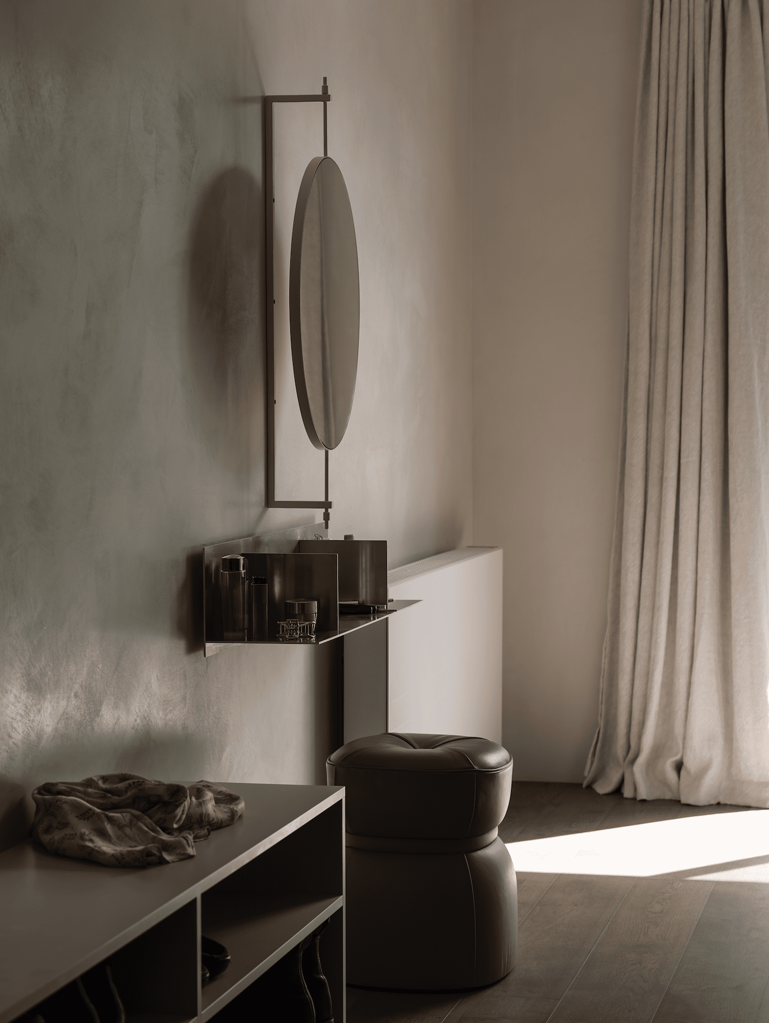 Merging with the creamy plastered walls, the colour palette throughout the home is chosen to allow the big views to take precedence. Natural, tactile fabrics such as wool, leather, velvet, and linen create depth of texture. Marble, steel, and oak feature strongly in the furnishings and shelving throughout the house, providing contemporary lines that contrast beautifully with the soft flow of the walls and window dressings.
