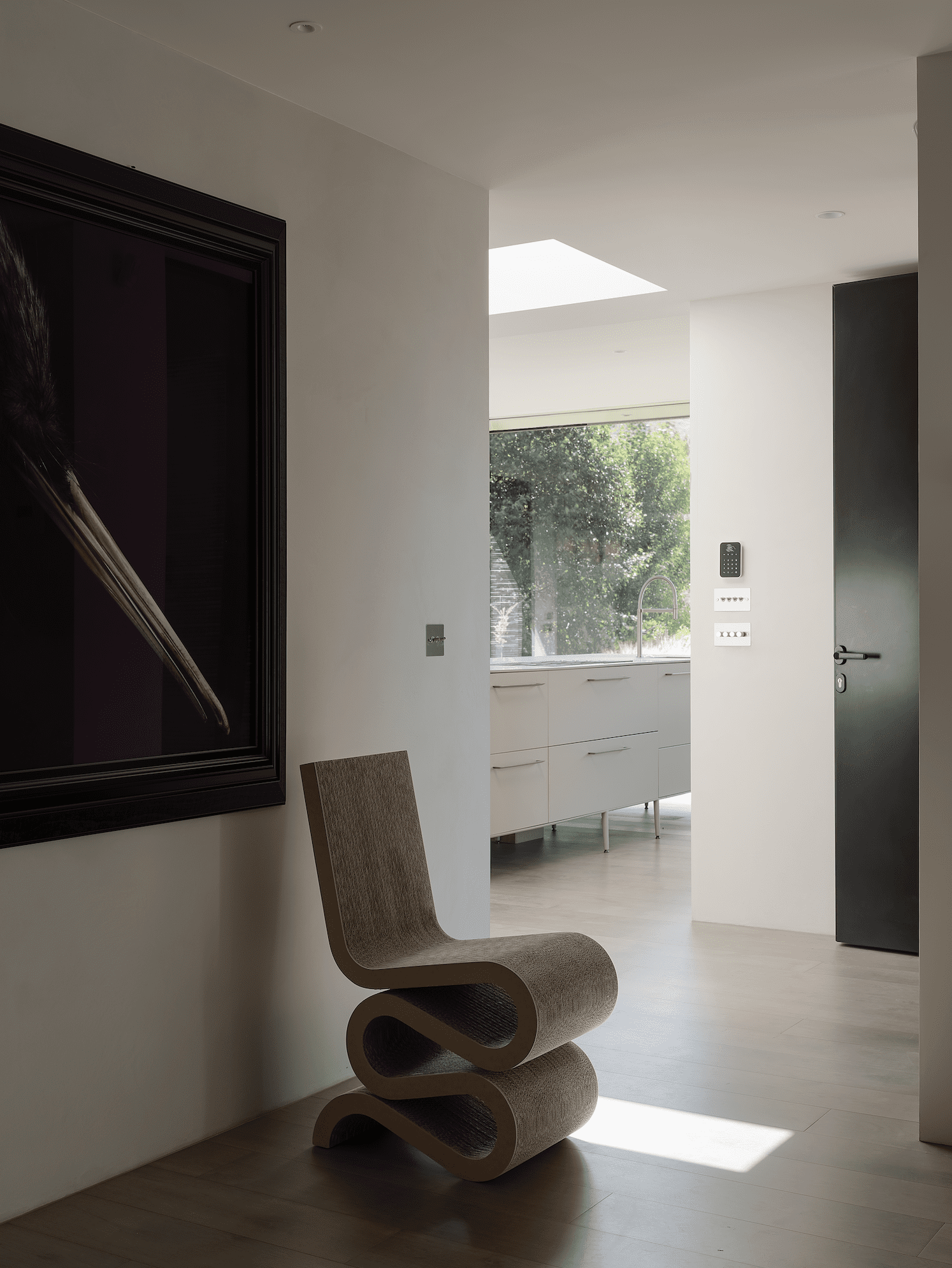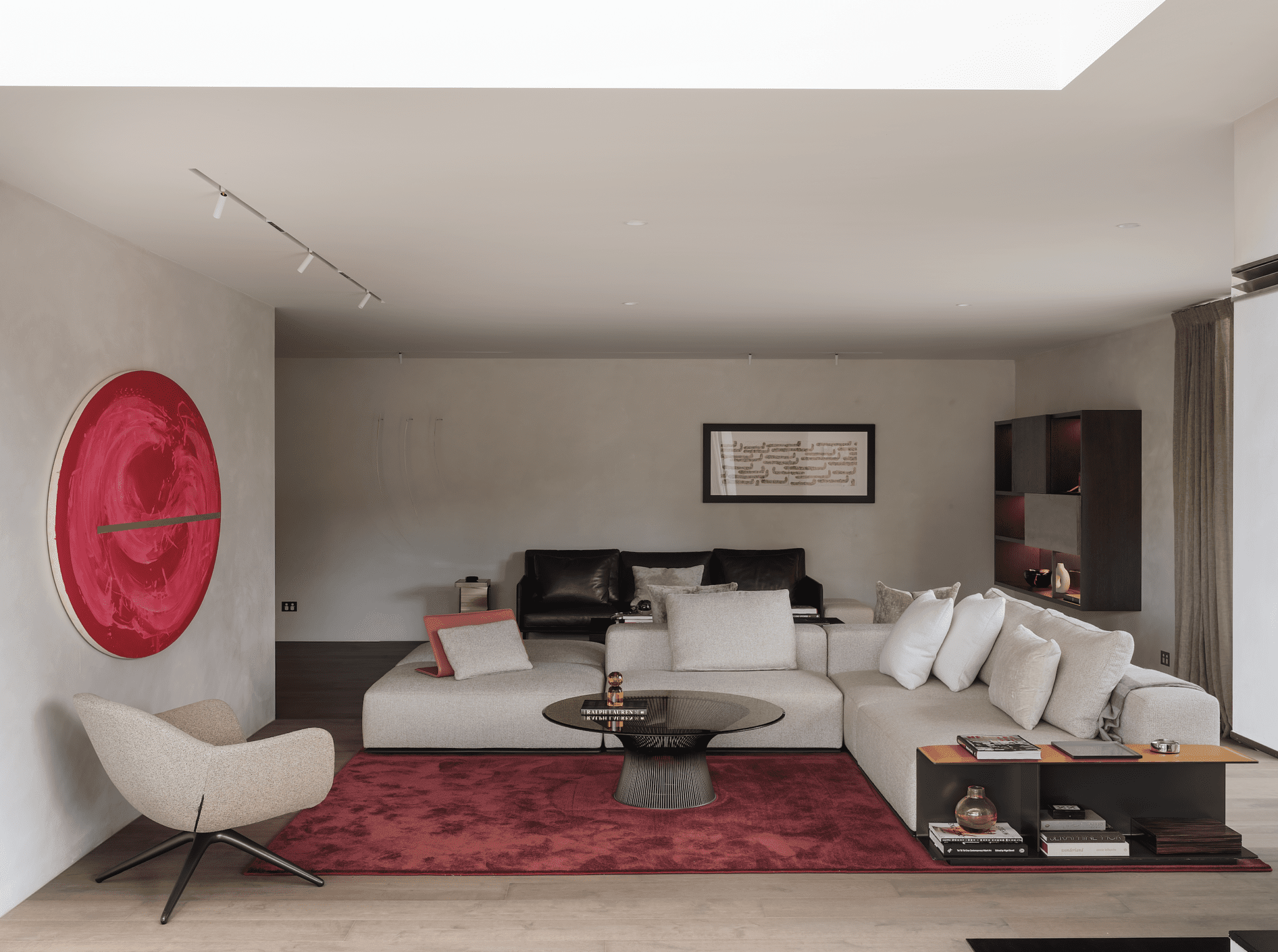“Restrained yet bold colour is then kept to the floor rugs and the clients’ impressive New Zealand art collection, such as the crimson Gretchen Albrecht oval work in the living room,” Karen explains.