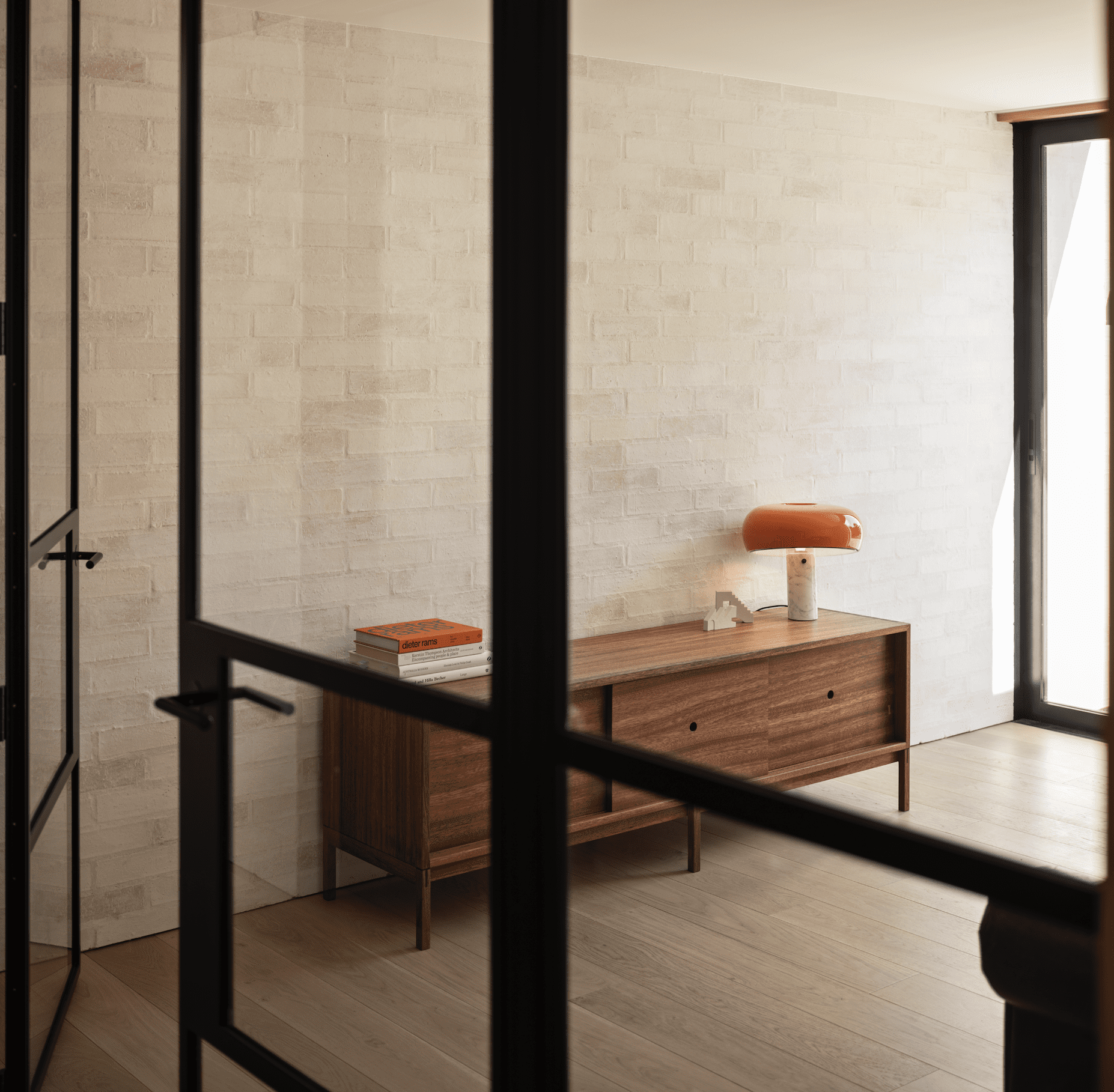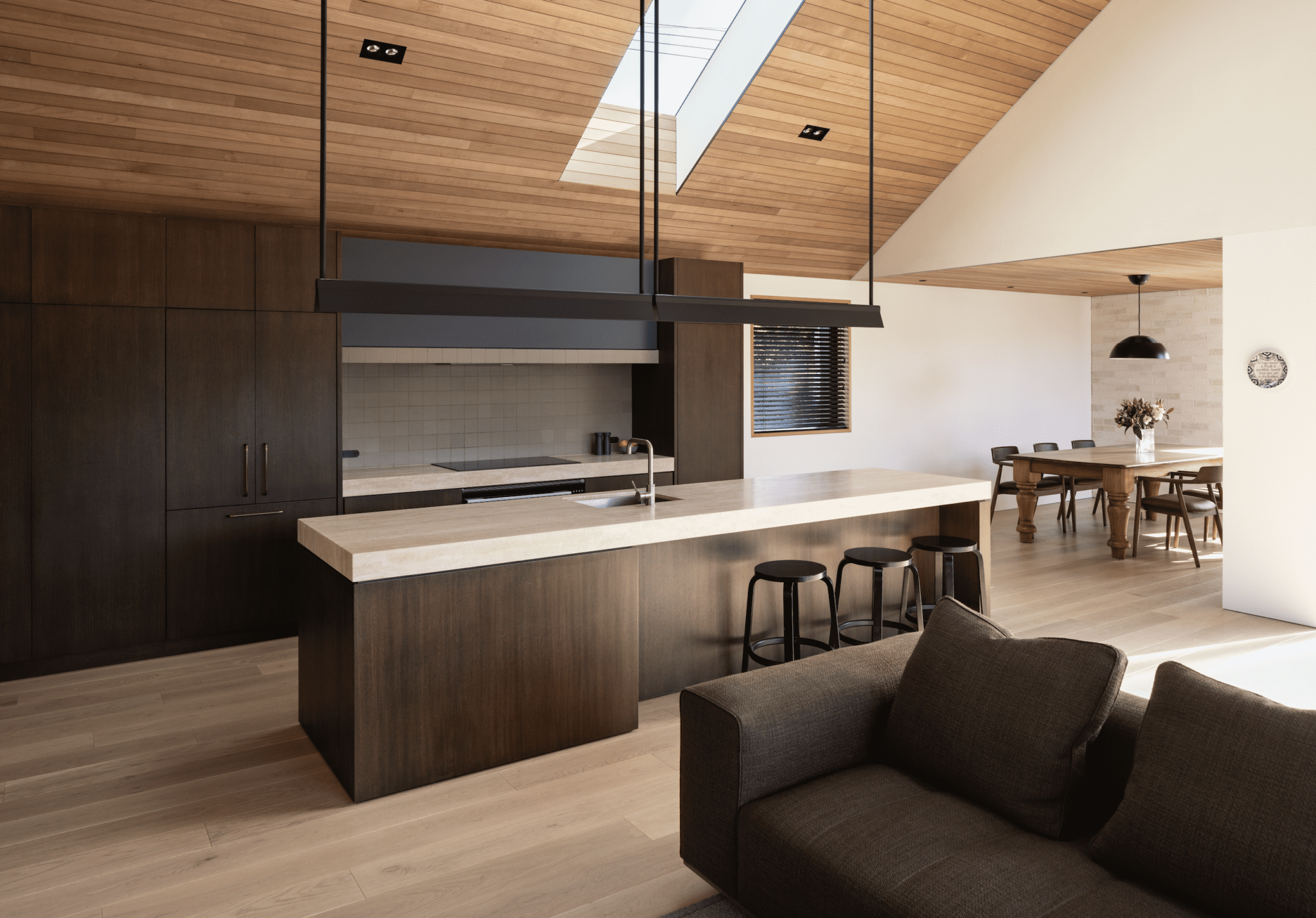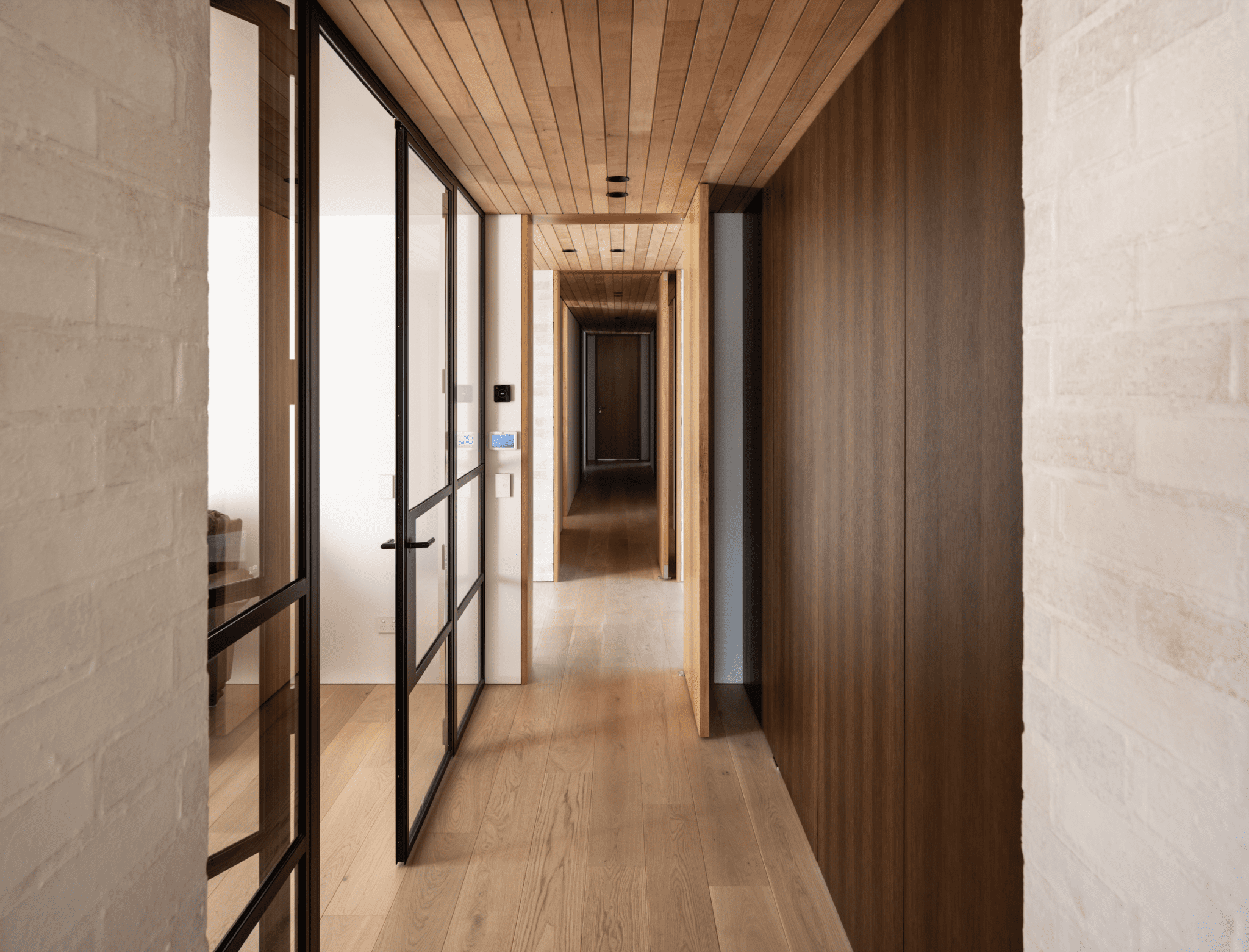 The interior is a soothing combination of materials: bricks of three different colours, from Canterbury Clay Bricks, all with a light wash of plaster over them so you can still see the subtle tonal differences; Southland beech, American white oak, travertine, and dark frames on glass doors. Redmond says that there is a touch of Belgian architect Vincent Van Duysen here, with his subtle and grounded interiors.