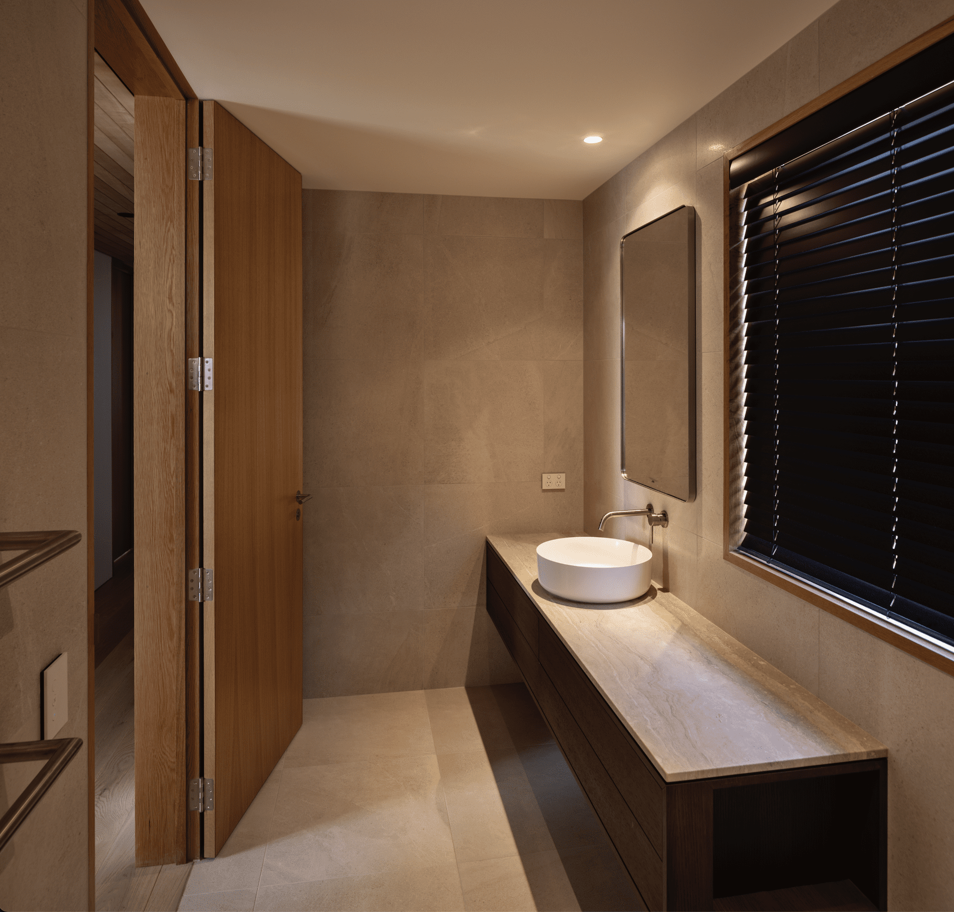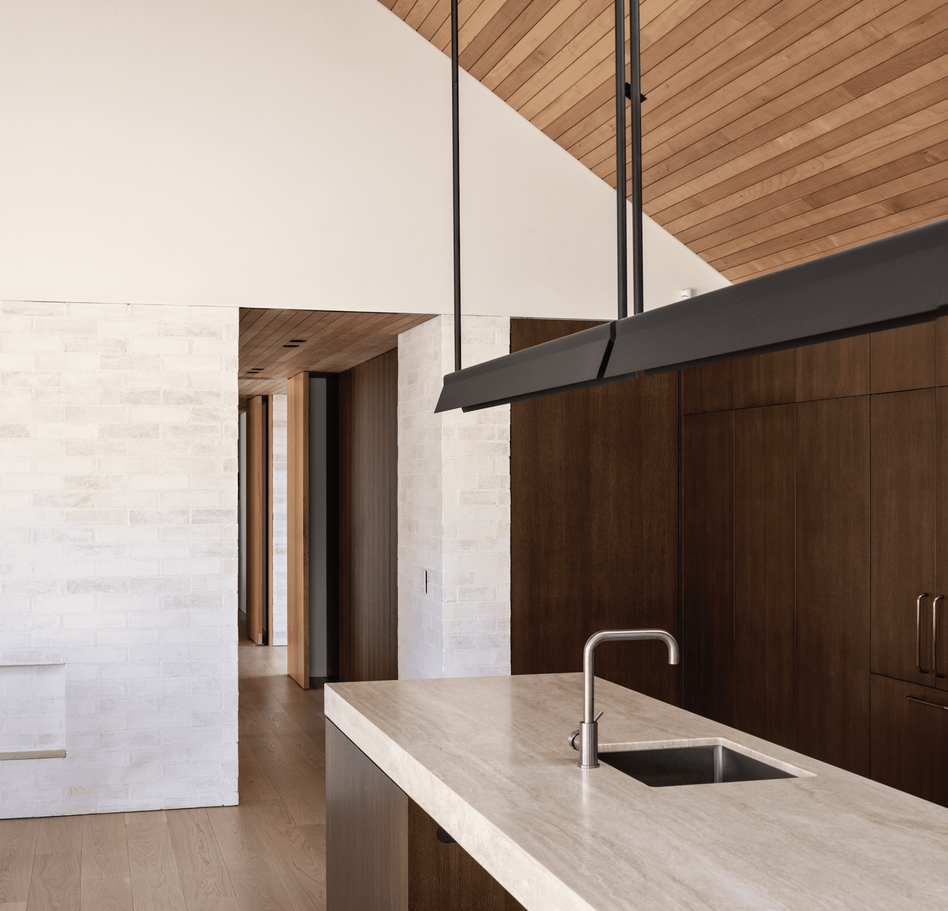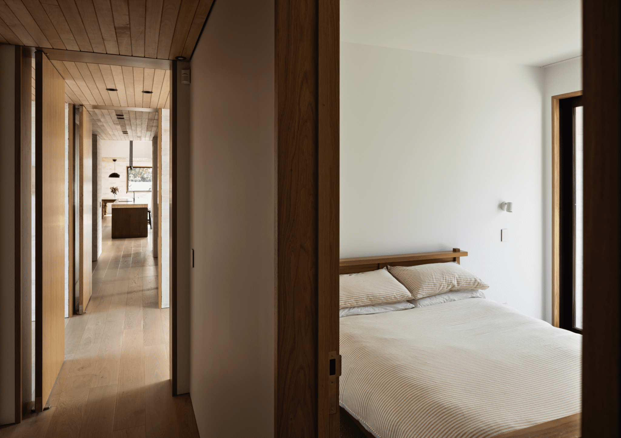 The interior is a soothing combination of materials: bricks of three different colours, from Canterbury Clay Bricks, all with a light wash of plaster over them so you can still see the subtle tonal differences; Southland beech, American white oak, travertine, and dark frames on glass doors. Redmond says that there is a touch of Belgian architect Vincent Van Duysen here, with his subtle and grounded interiors.