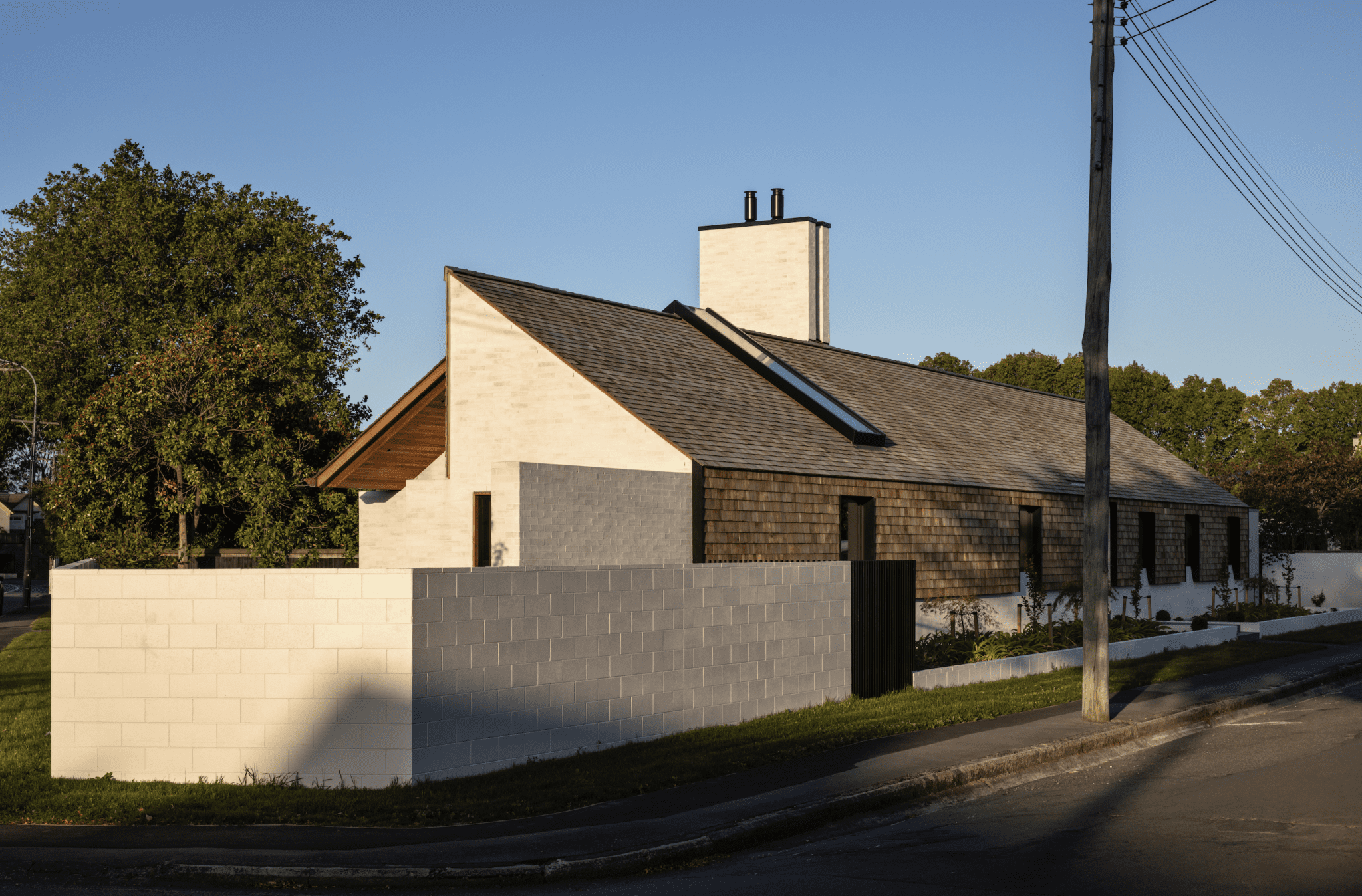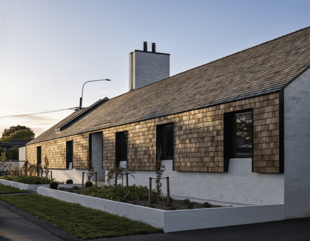 The proportions of these external walls can be read as Miles, almost echoing the Dorset Street flats and — on the facade detail that then extends onto the chimney — even the parallel fins of the Christchurch Town Hall. It is, however, at the western elevation that the echoes of Miles are at their loudest and most expressive.