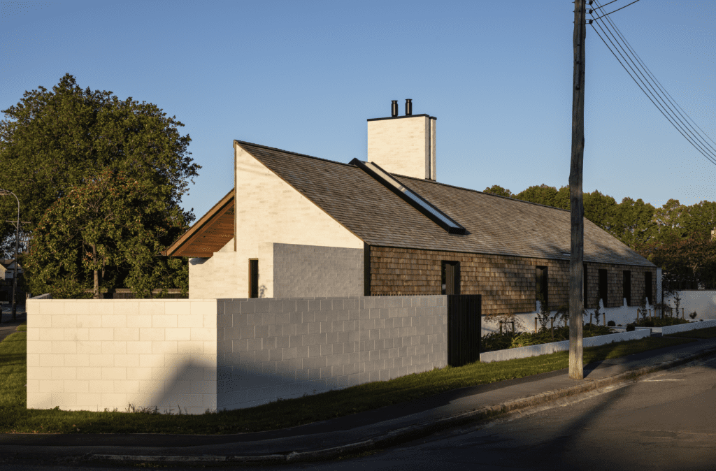 “That is really aesthetic driven and derived from a lot of Sir Miles’ work, with those quiet, really simple gable forms … with the wee pitcher window at the front,” says Redmond. “It was really a play on that, plus seeing the articulation created by the roof peeled back and peeled down while trying to create a screen on the street side. You can show the architectural moves within the project, and create a dynamic corner that tells the story of the design.”