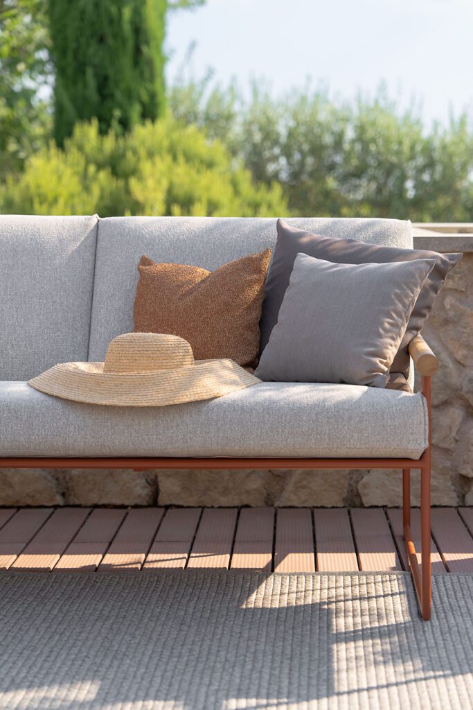 The Pipe Collection is defined by a refined interplay of materials. A slender, powder-coated steel frame, rendered in a distinctive terracotta tone, establishes a clear architectural line. Teak armrests introduce warmth and tactility, while a handwoven grey rope backrest brings lightness and permeability. Together, these elements create a composition that is both robust and nuanced, offering a calm, grounded setting for long afternoons outdoors.