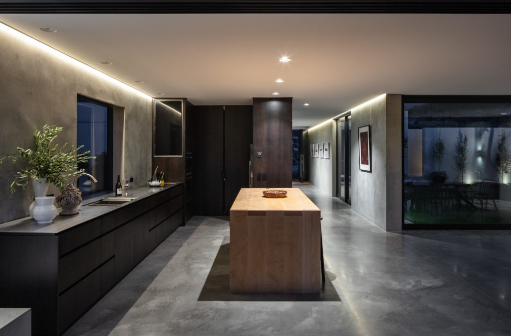 Those panels are juxtaposed with a polished concrete floor, which is “a dark float-finish concrete using Peter Fell colours. It was intentionally made to seem hand finished.”