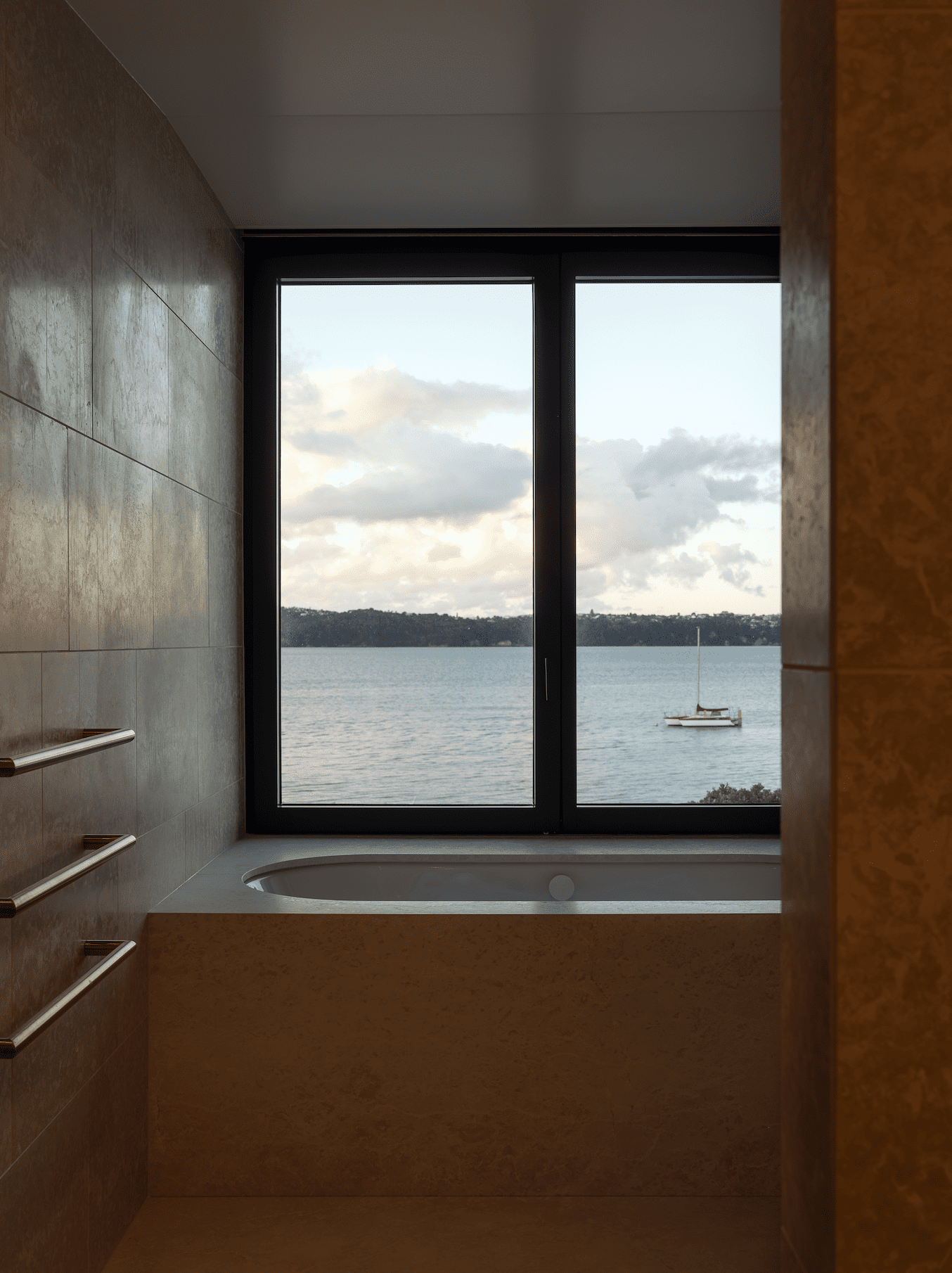 In the primary ensuite, two striking Artedomus sinks in maroon Rosso Levanto marble take pride of place. They’re the only pops of colour; otherwise this floor is a continuation of what Lithgow describes as a “recessive palette”.