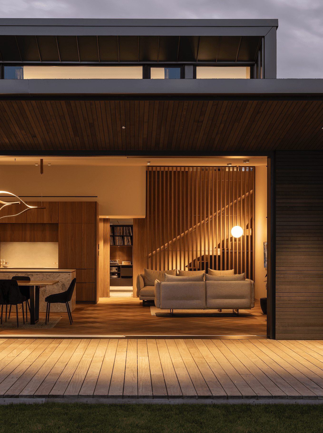 Lithgow created deep, cedar-lined eaves on the deck, to provide an al fresco area that is sheltered from weather. The design “deals with a bit of a shading element, while giving the family sky and height, so the horizontal line isn’t in their vision,” Lithgow tells us.