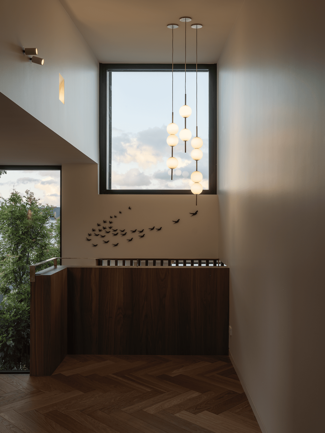 Peel back the vaulted front door — a passive house requirement to ensure airtightness — and a slim floor-to-ceiling window tells you that you’ve arrived at the water’s edge. VidaSpace herringbone floors lead from the entranceway down to what once was the basement, now a light-filled living area with incredible views.