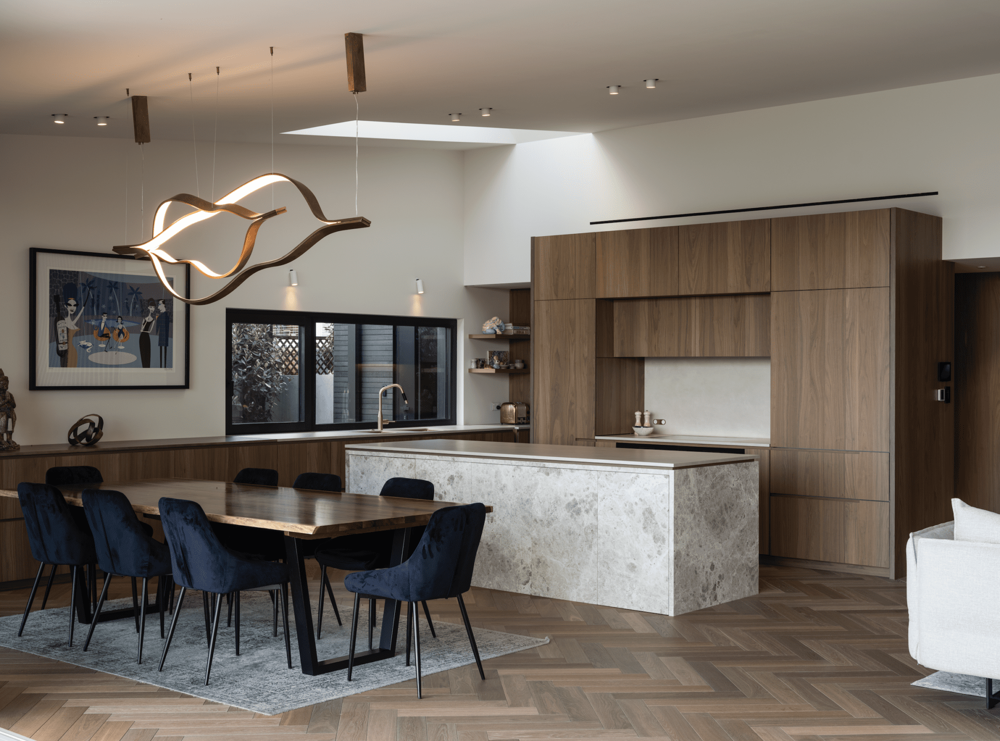 Unusually, the front of the island concertinas away, to reveal stools and space to sit. “I love this island; it brings the pattern alive rather than being flat,” Lithgow says. “I love all of the texture in this house. That’s the expression of the design, and you can run your hands over the textures inevery room.”