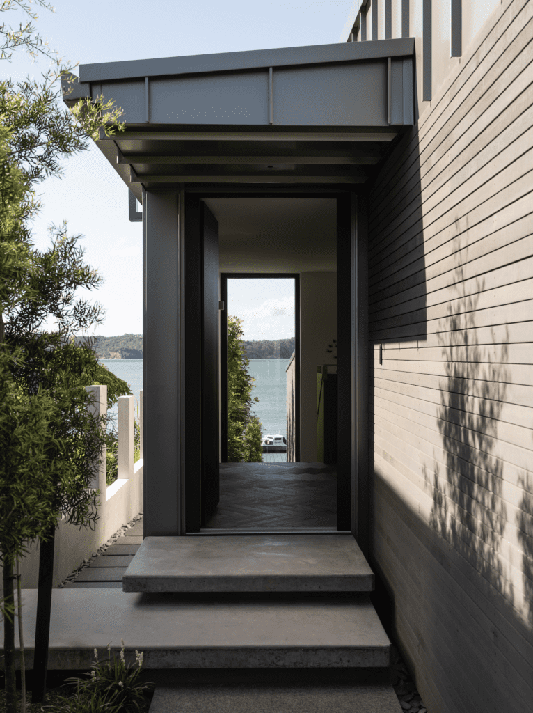 The passive house–approved glazing and joinery imported from Europe peels back to expose the entire width of the living floor and to make the most of the view of the harbour and Chelsea sugar factory.