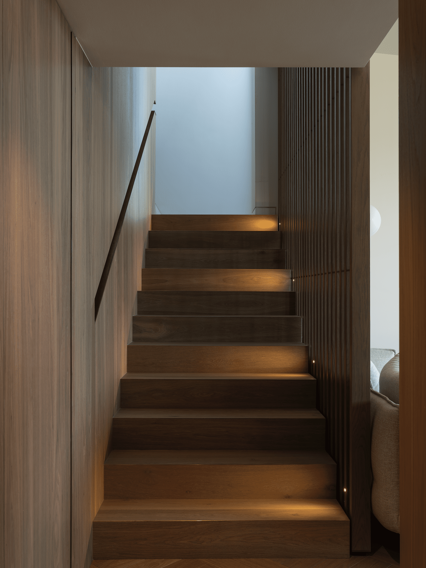 The architect intentionally split the public and private spaces of the home by levels. “The top is private and the downstairs is public,” he explains. “From the entranceway, there’s no reason for a visitor to go into the family’s private areas.”