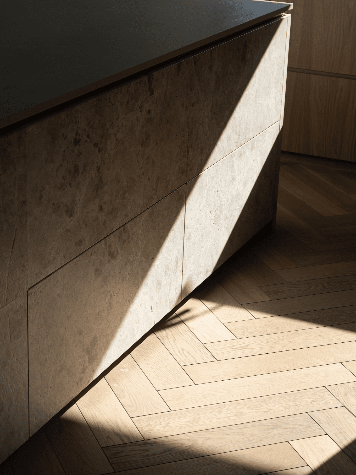 The kitchen island, clad in Tundra Light Grey, is an exercise in quiet luxury. Lithgow specified that the marble be leathered to create a textured feel.