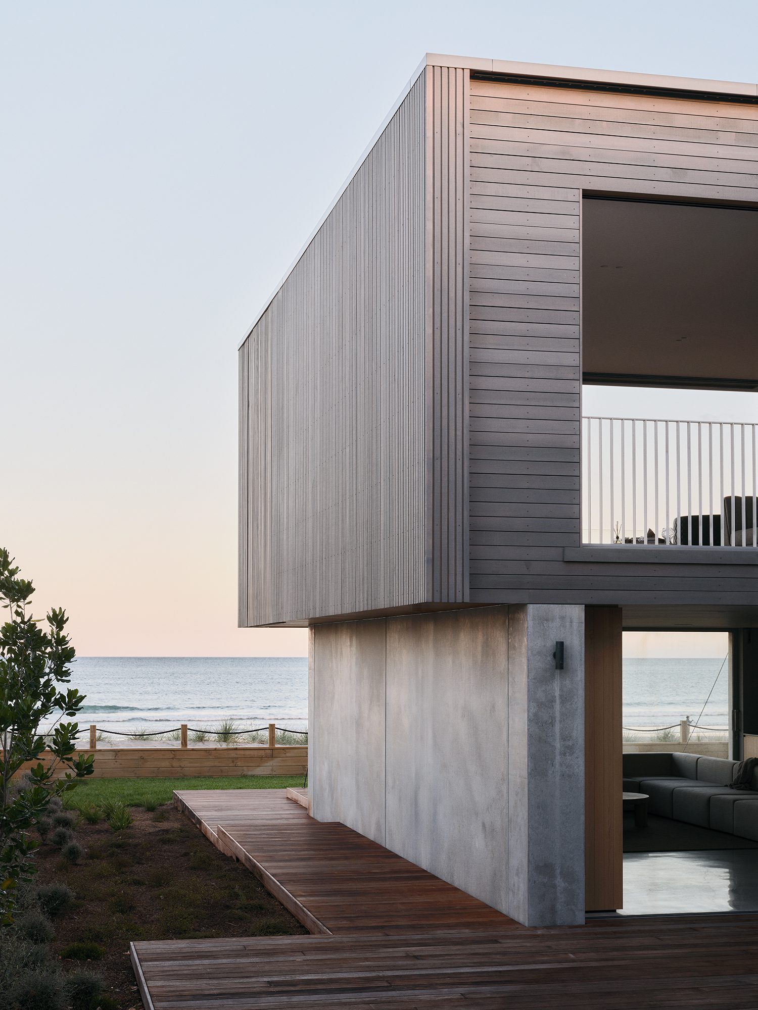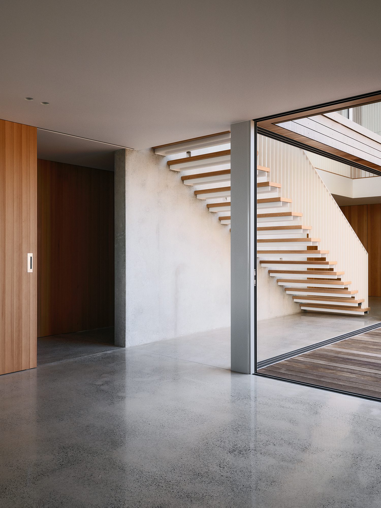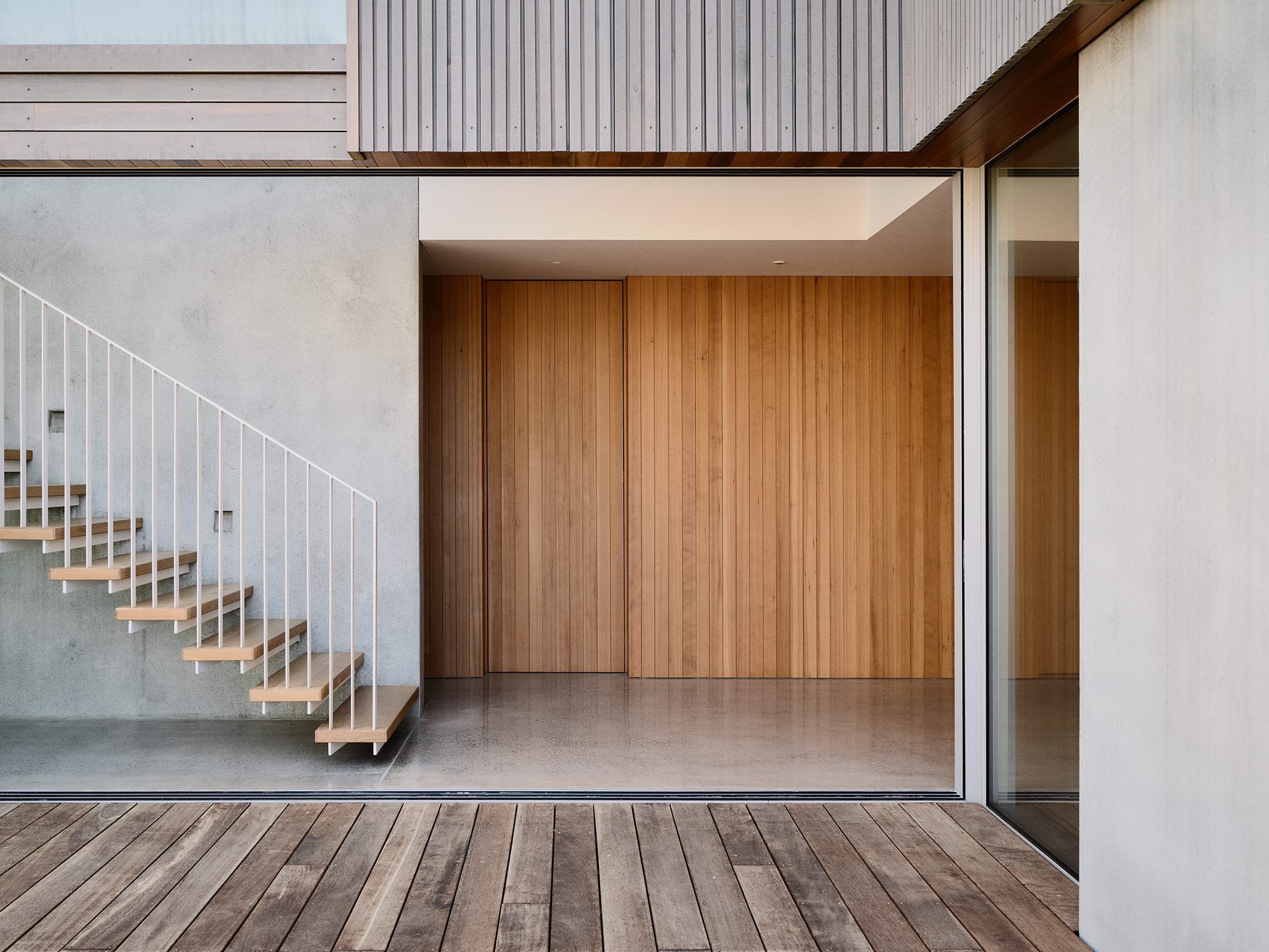 “The eye is immediately drawn through the dwelling and out to the ocean. A timber-clad spine guides you past the courtyard and a double-height space, anchored by a floating stair, towards the sea,” Scott says.