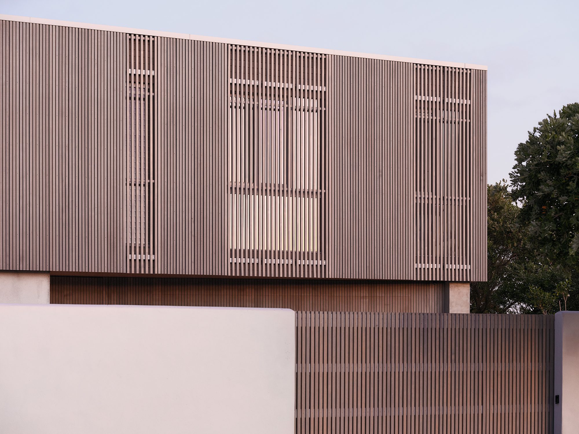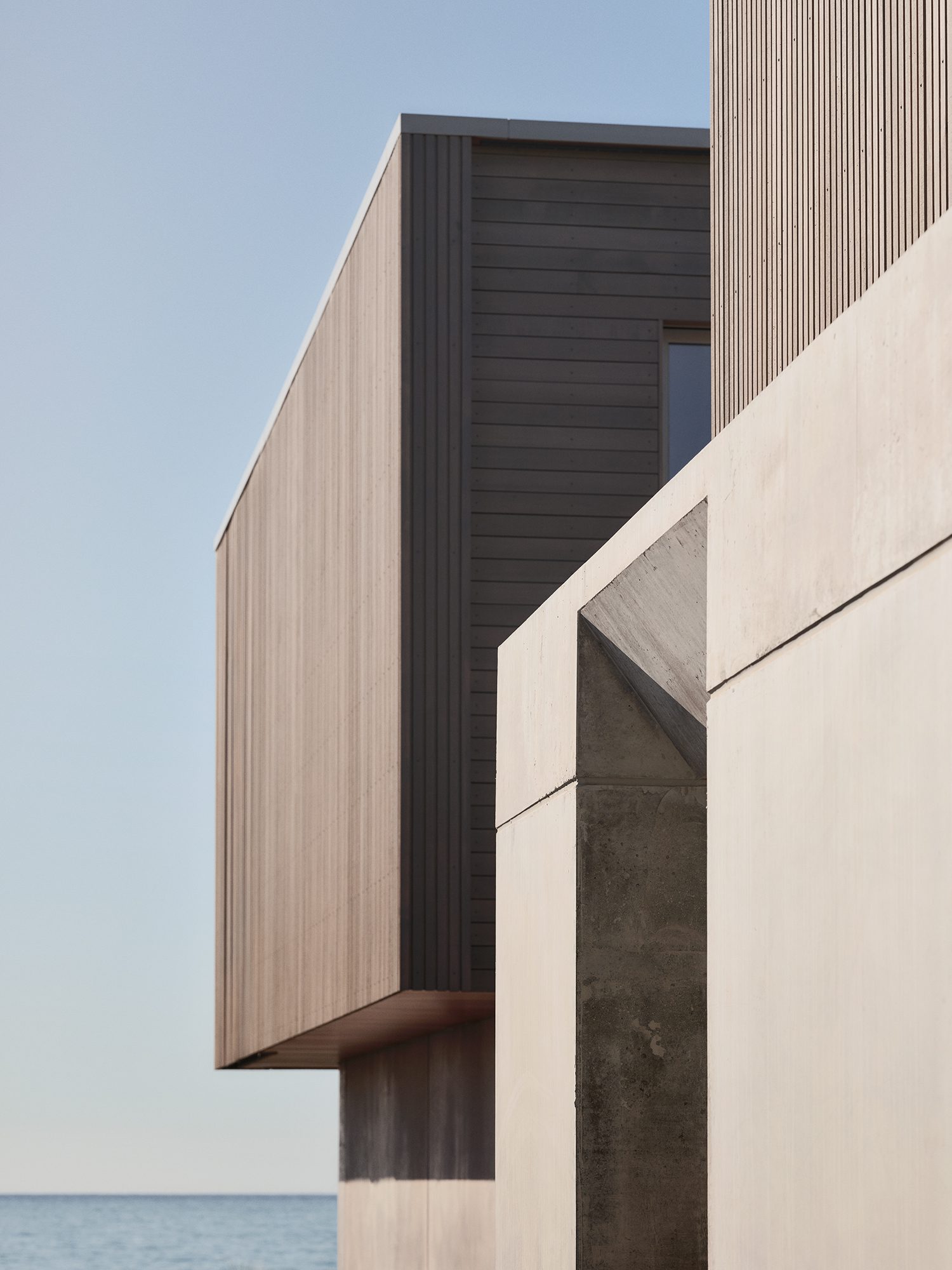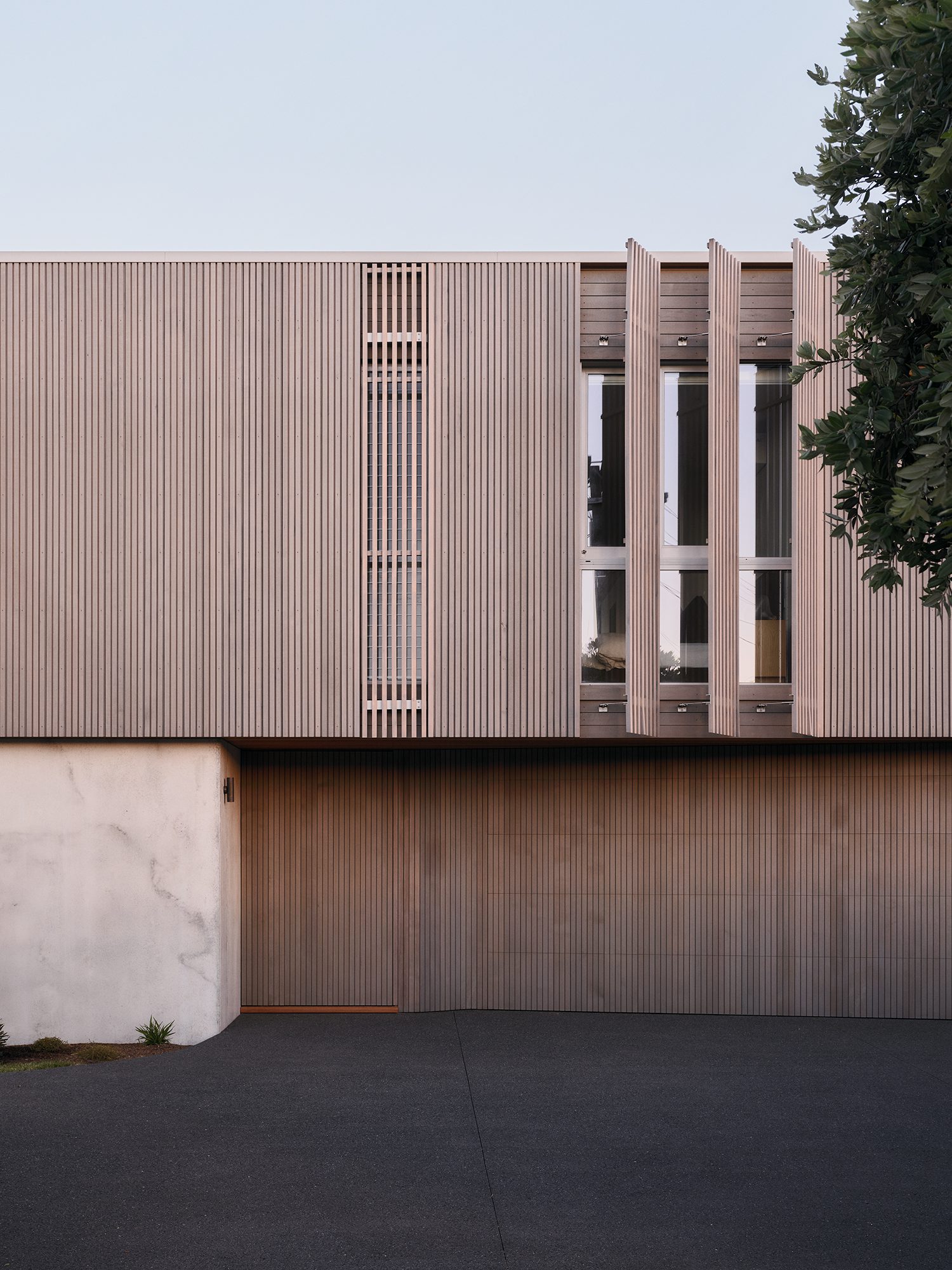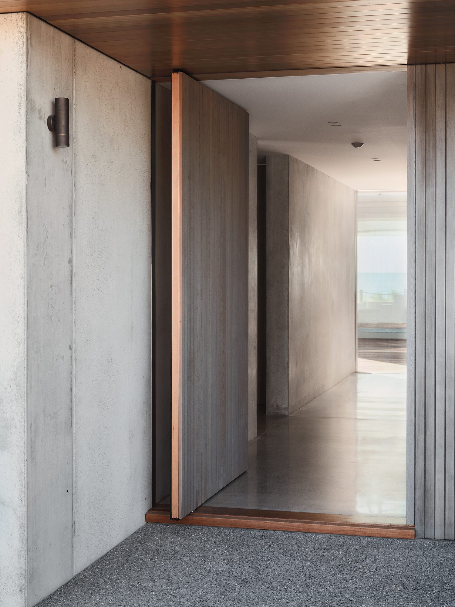 Pedestrian entry is by way of a large timber pivot door that breaks the robust concrete volume at ground level.