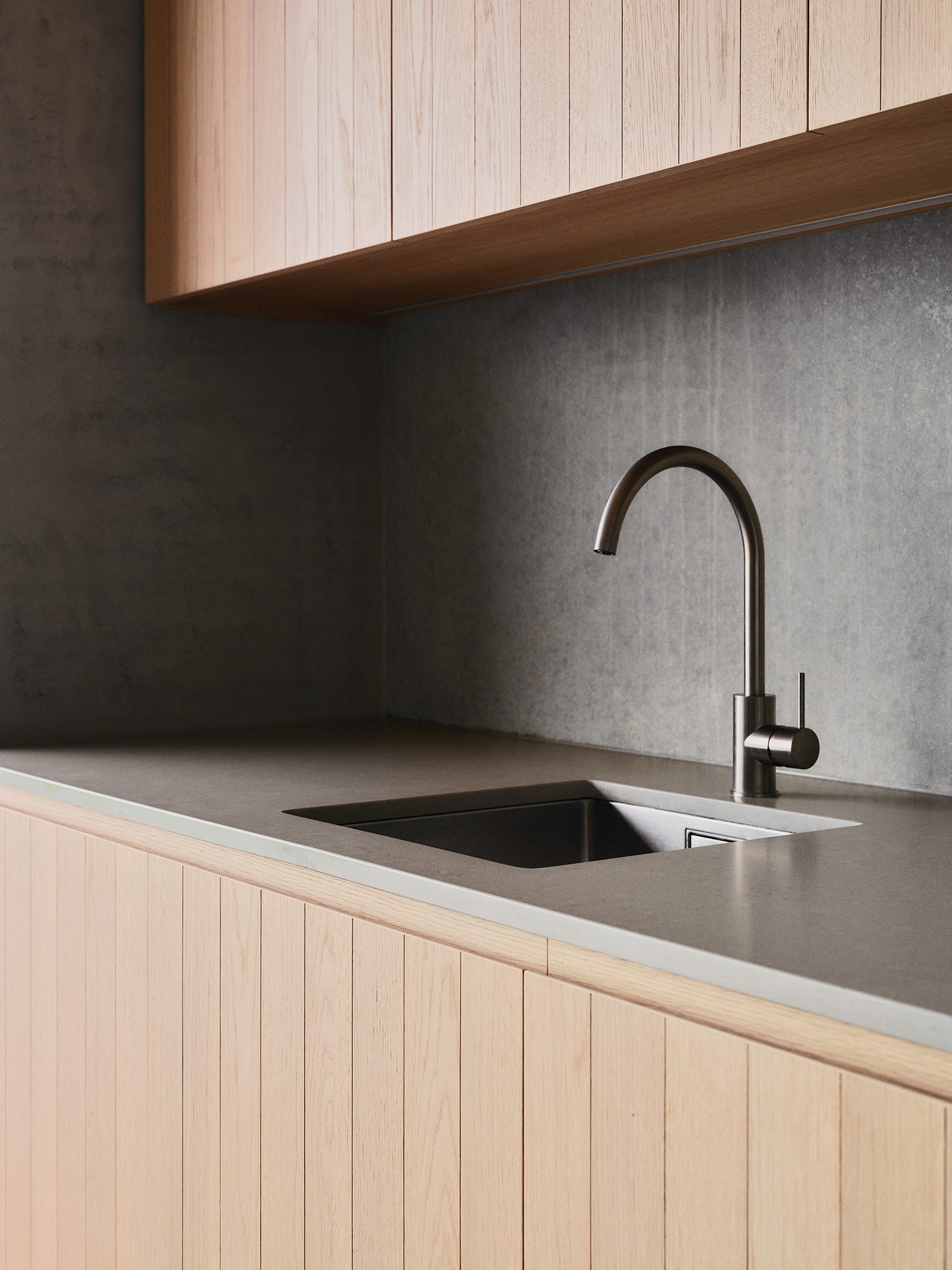 “It’s a really tactile space, with oak veneer panels and engineered stone benchtops.” Pendants from Snelling Studio hang above the island; underfoot is engineered European oak flooring.