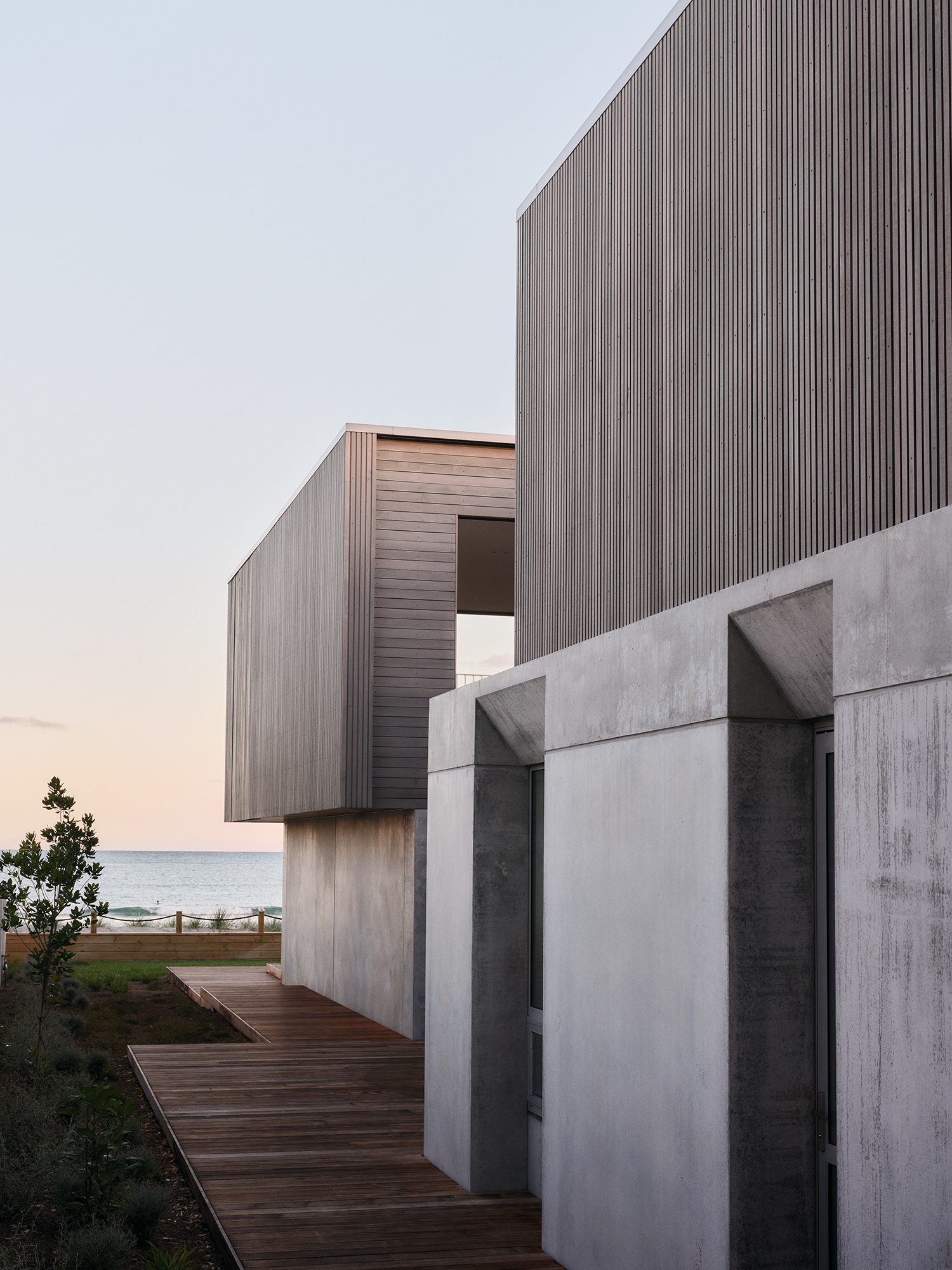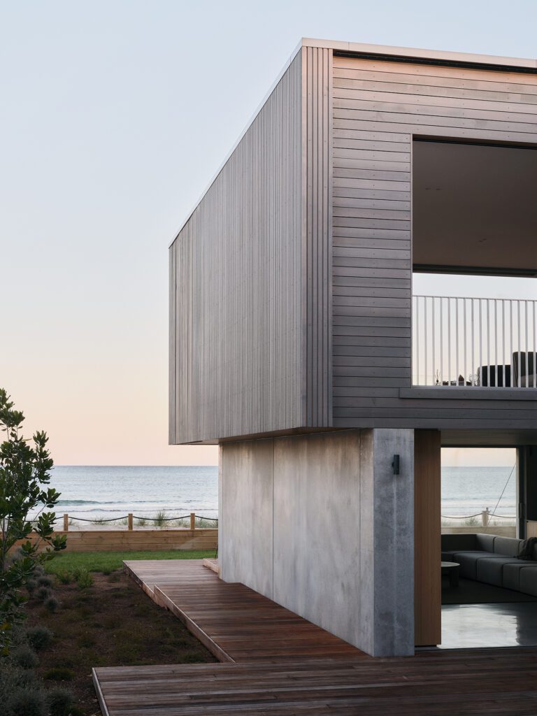 The use of natural concrete and timber allows the house to settle gracefully into the dunescape — the muted tones of the concrete echoing the grey sands of the dunes, the timber’s hues a nod to the natural grasses that cover them, and to the dramatic cliffs that frame the beach.