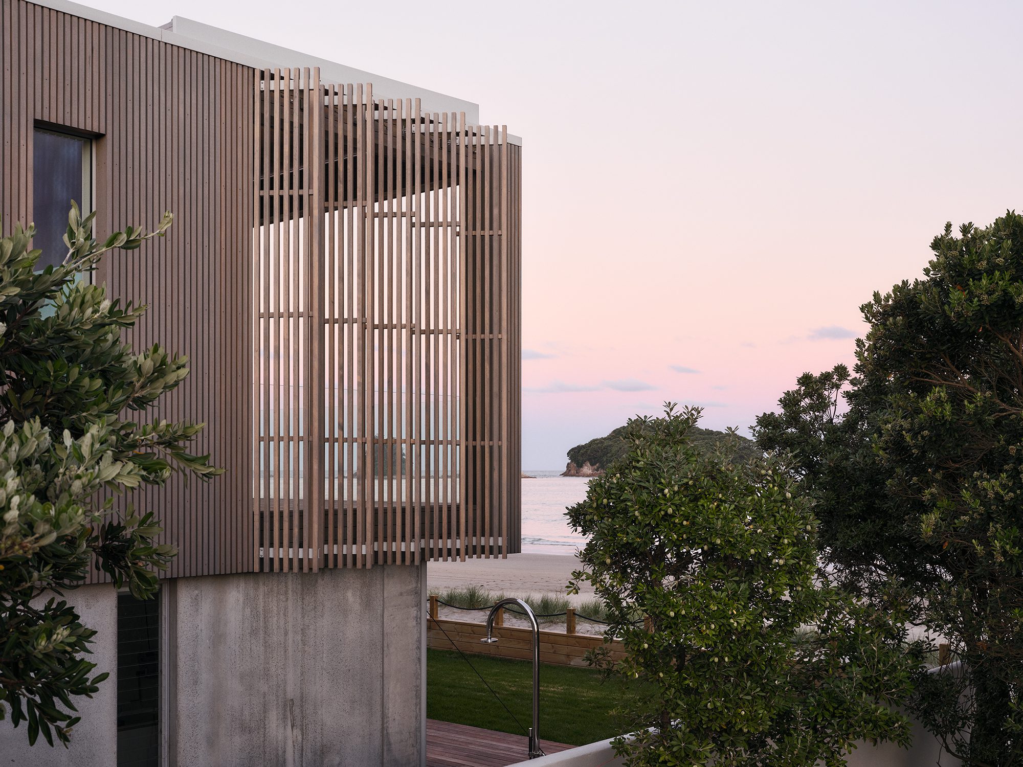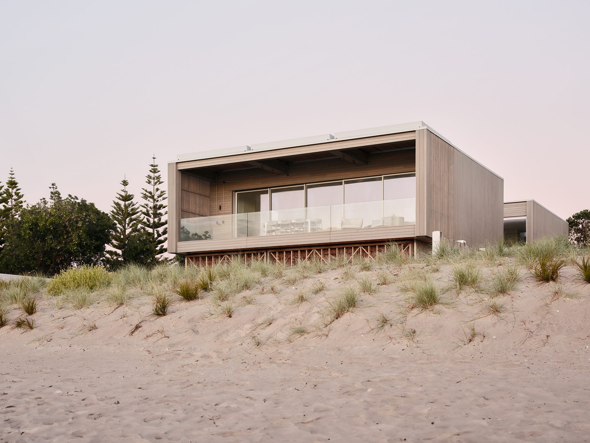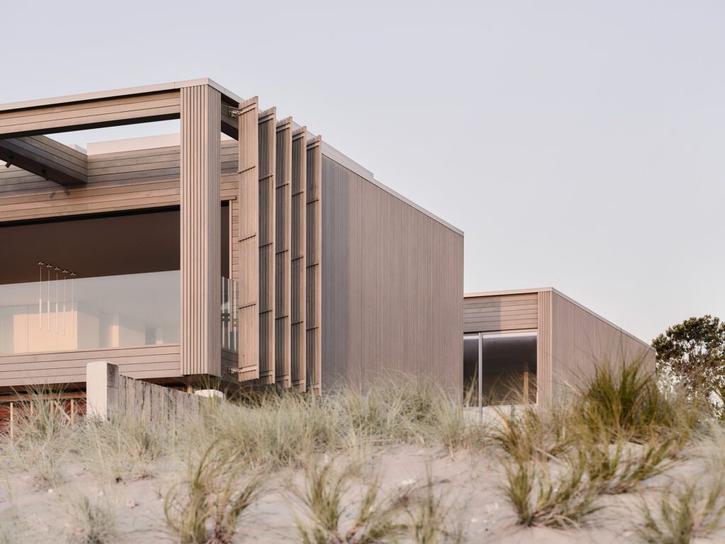 The UK-based client had holidayed in the Whangamata area for many years, and aimed to create a place for his large family to come together when he visited New Zealand each summer. The brief was for a home that could comfortably house two or three people — or very large groups. It had to make the most of its beachfront site, and open and close to the ocean and the elements as desired. It also had to offer a degree of privacy to account for the population influx over the holiday periods in the otherwise sleepy coastal town.