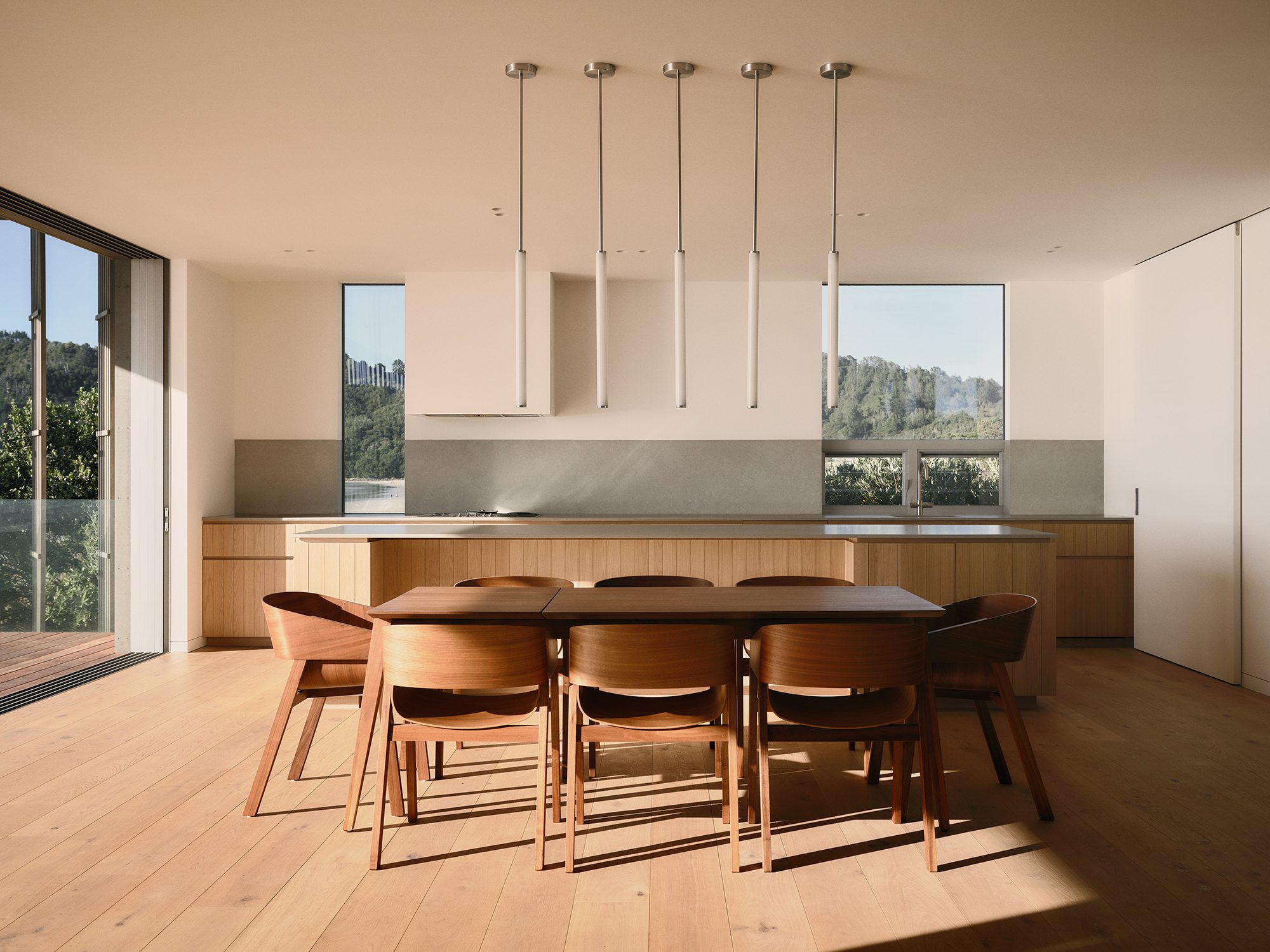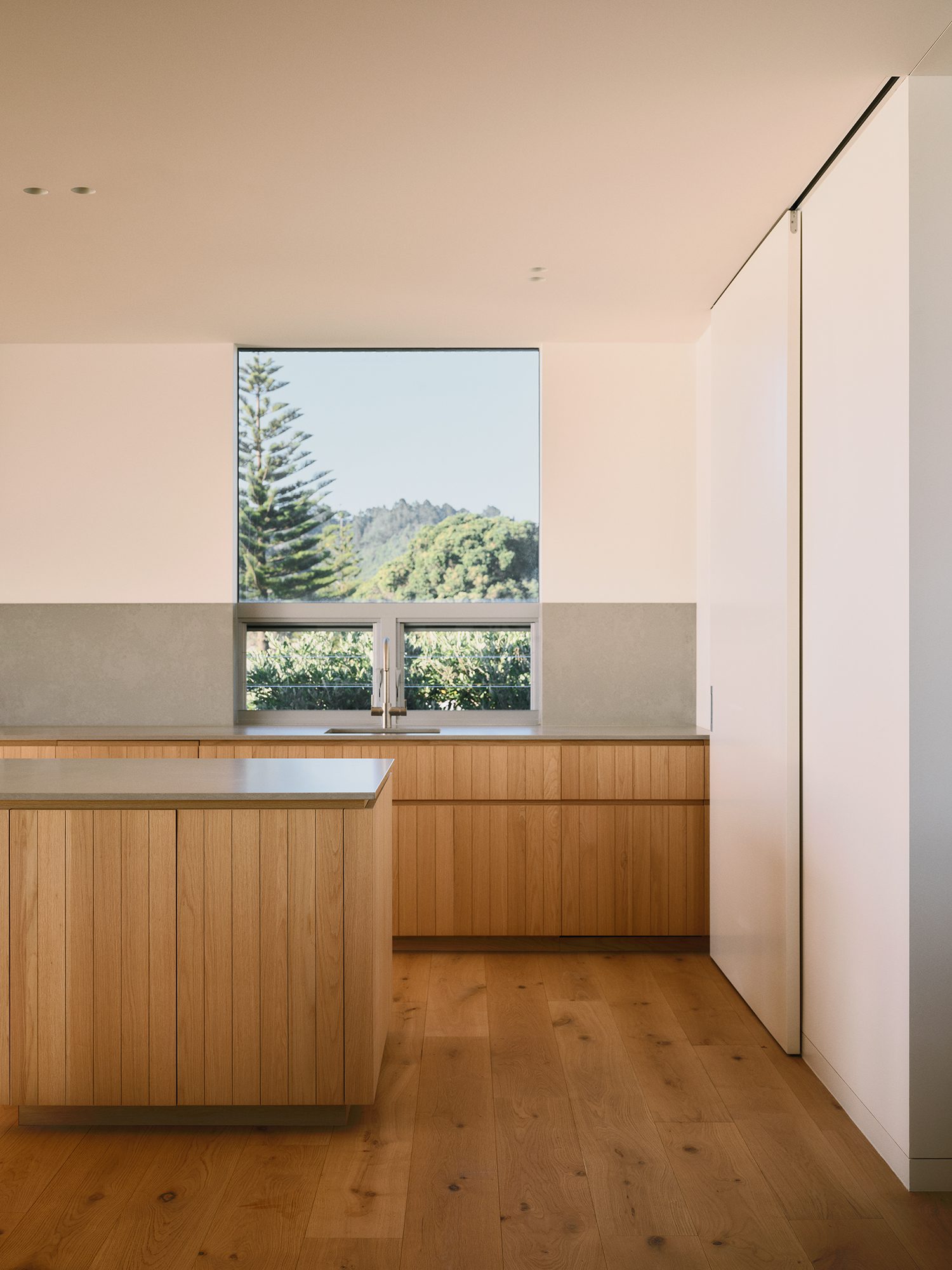 Kane says, “It’s such a stunning site. You have vistas of the sun rising over Mayor Island, the cliffs, and the beach. The brief was centred around capturing and connecting with these views. In the living area, you feel like you are almost on an island looking over the water.”