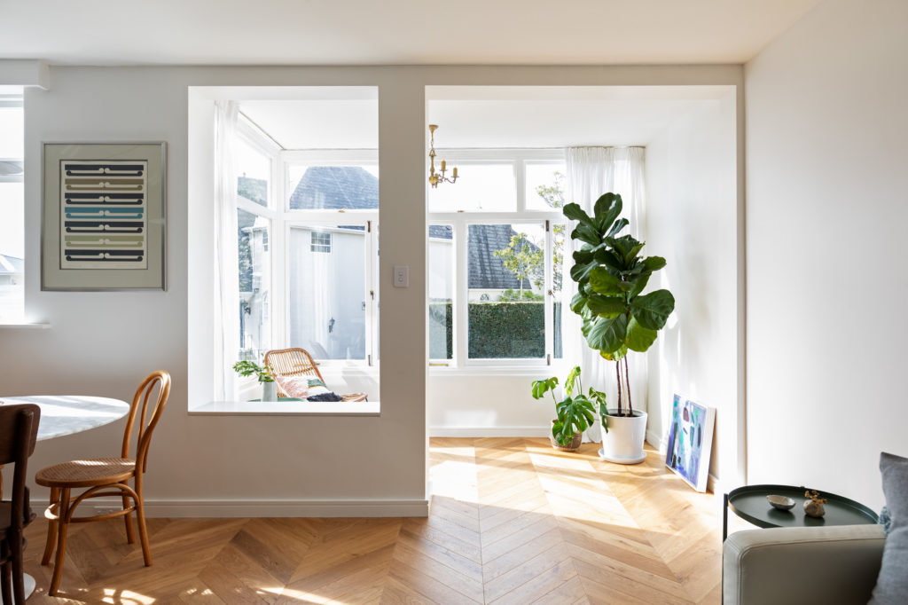 In this apartment, there is a sunny little conservatory that looks onto the street and is partially separated from the living area. Initially, we had wanted to open it up completely and make the living area bigger, but as it was structural we were forced to leave it in place, which I’m now so glad of. Even though it’s open to the living room – it is defined by a thick column and a low wall. Its just enough implied separation to make it feel like another room to go and enjoy a morning coffee or afternoon wine and say hi to neighbours out on the street, but at the same time it reads as being part of the living room and makes it feel more spacious