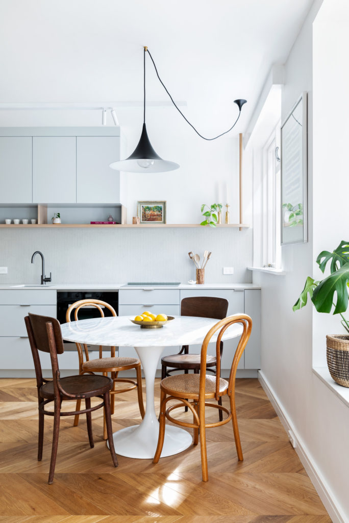 The outlook from the apartment takes in a cluster of French-style townhouses, so that was one that cue we picked up on – a space with light and air but the solidity and reassurance of solid oak floors combined with the simple clean lines of contemporary cabinetry – almost as if you could be in a European pied-à-terre in Paris or Stockholm.