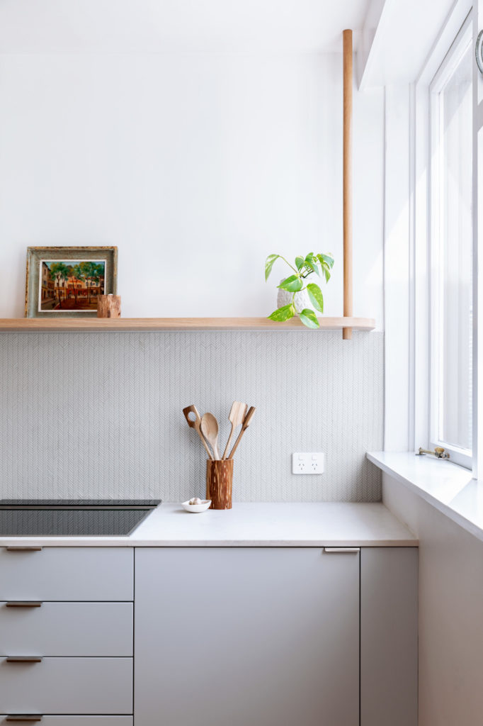 The curves in the design reference a small curved cupboard that was in the original apartment but had unfortunately deteriorated too much for us to keep. The new ‘hall side table’ is the perfect place to throw your keys, hide your shoes and other everyday bits and pieces when you walk in the door. It’s a small gesture but it’s surprisingly useful and establishes a tone of unobtrusive sophistication. From there the floor to ceiling oak-faced cabinetry leads you down a generous hallway into the main living area where it becomes the kitchen and changes to a subtle grey-blue painted finish with oak accents. Because the kitchen shares the living space, it was important to us to integrate as many appliances as we could and keep it looking simple.