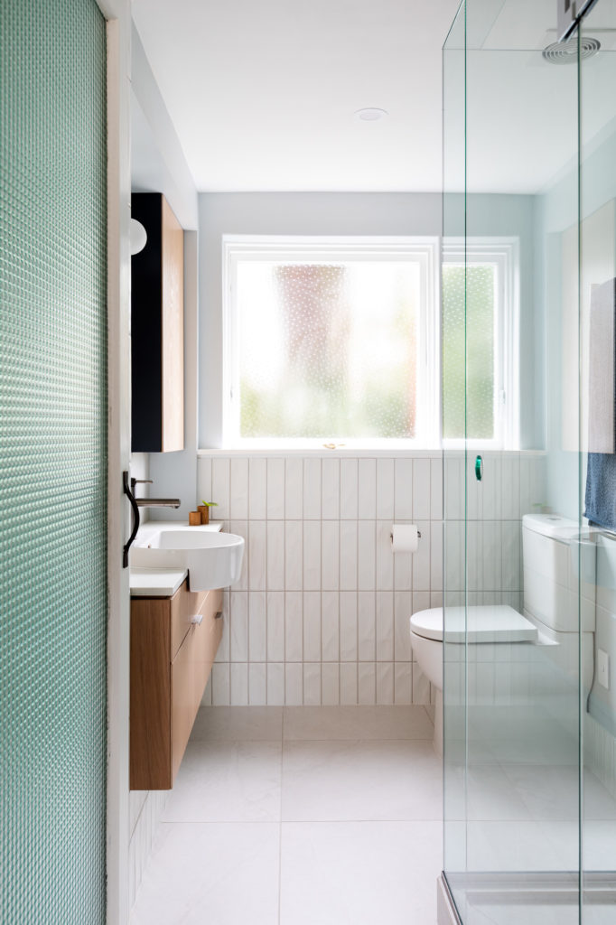 Translucency/materiality: Warm oak, subtle texture in the chevron parquet French oak floor; tiny matte glass herringbone mosaic tiles in the bathroom. Matte finishes everywhere to keep the light in the apartment very soft – nothing shiny. We borrow light as much as we can to keep the space feeling lively and open throughout the day. The bathroom gets a surprisingly nice south-west kind of light, and gets some lovely shafts of late afternoon, low-angle sun in winter. We installed a timber framed glass door to the bathroom and found a beautiful, one-off densely textured glass from India languishing in the back of a warehouse (the glass company had it for 20 years and they were contemplating throwing it away!) that we laminated up and installed in a recycled timber door frame. This gives just enough privacy- (it’s a 1.5 bedroom apartment after all!) to the bathroom, and lets the faceted soft light fall into the hall. We used the same vintage glass to use it in a custom made pivot window which I designed to be part of the built in book shelf in the living room – but it also allows additional light into the guest bedroom /office and as well.