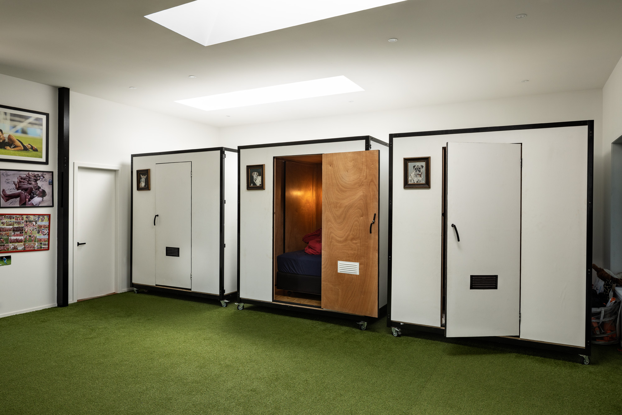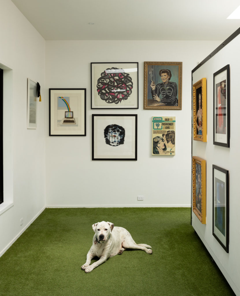 The interior, however, is not for the meek. The floor is clad with Astroturf, that green faux grass better known for indoor sporting venues than cosy home interiors. The walls have been left as utilitarian as possible, to accommodate the large art collection that includes graffiti, travel photography, glass pieces, and even original storyboards from Francis Ford Coppola’s Apocalypse Now.