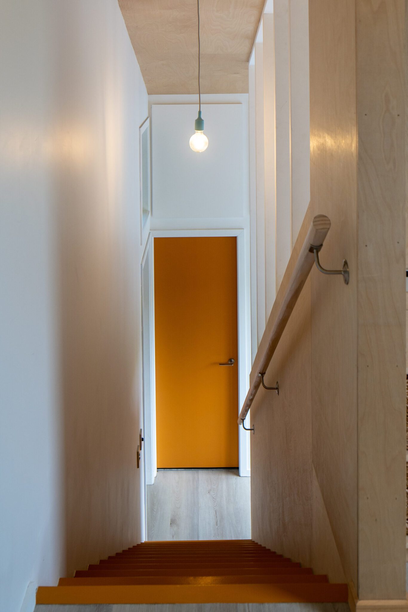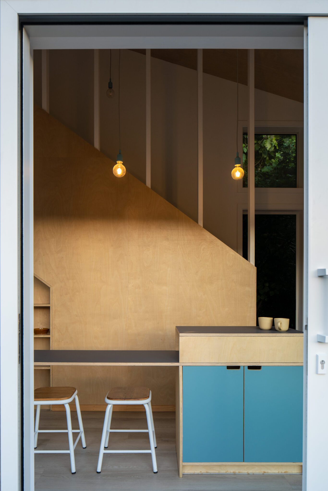 Internally, plywood along with pops of dusky orange and teal blue, give the spaces a cool casual personality, which ties in with expansive views across the valley to a faraway glimpse of the entrance to the port.